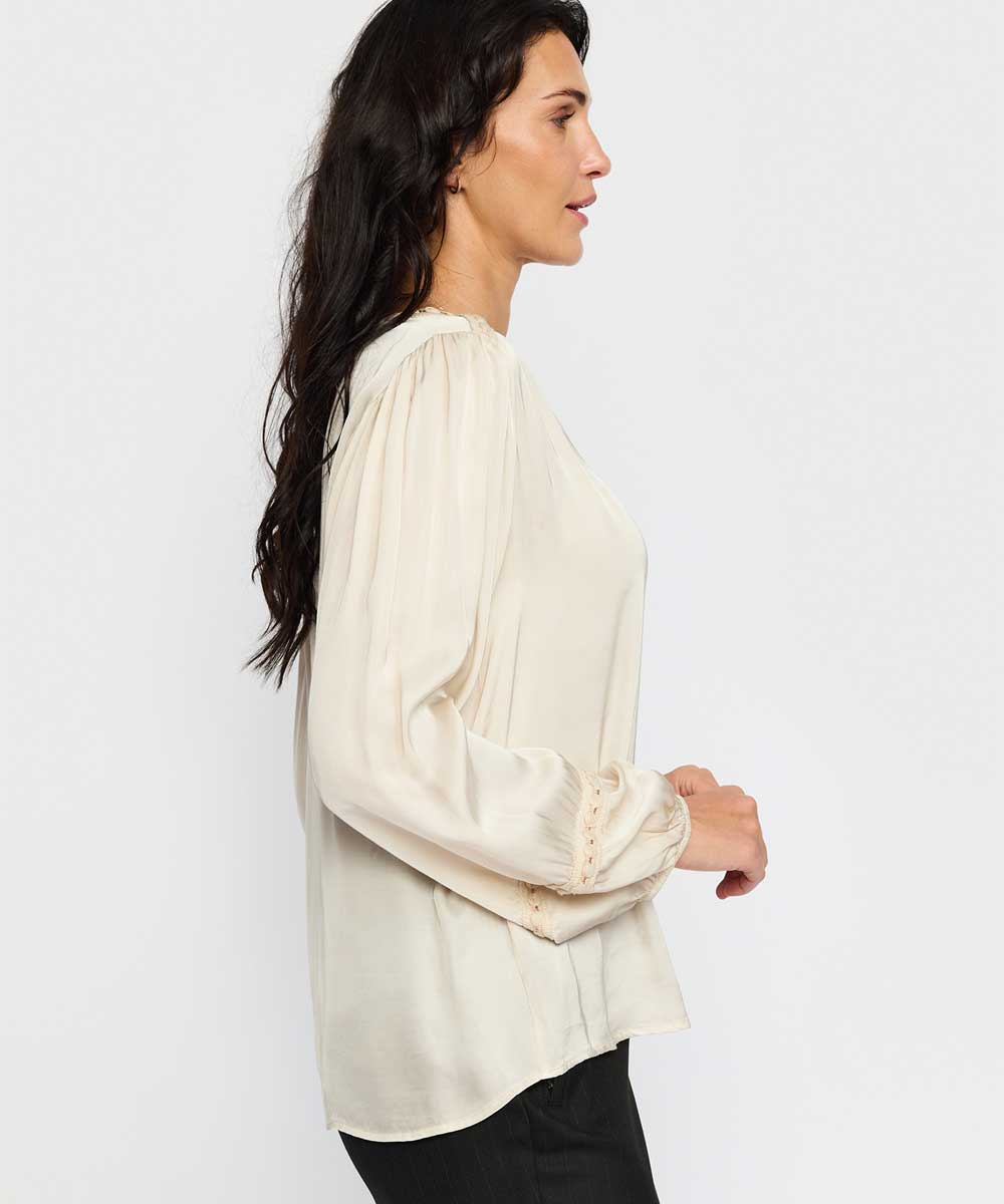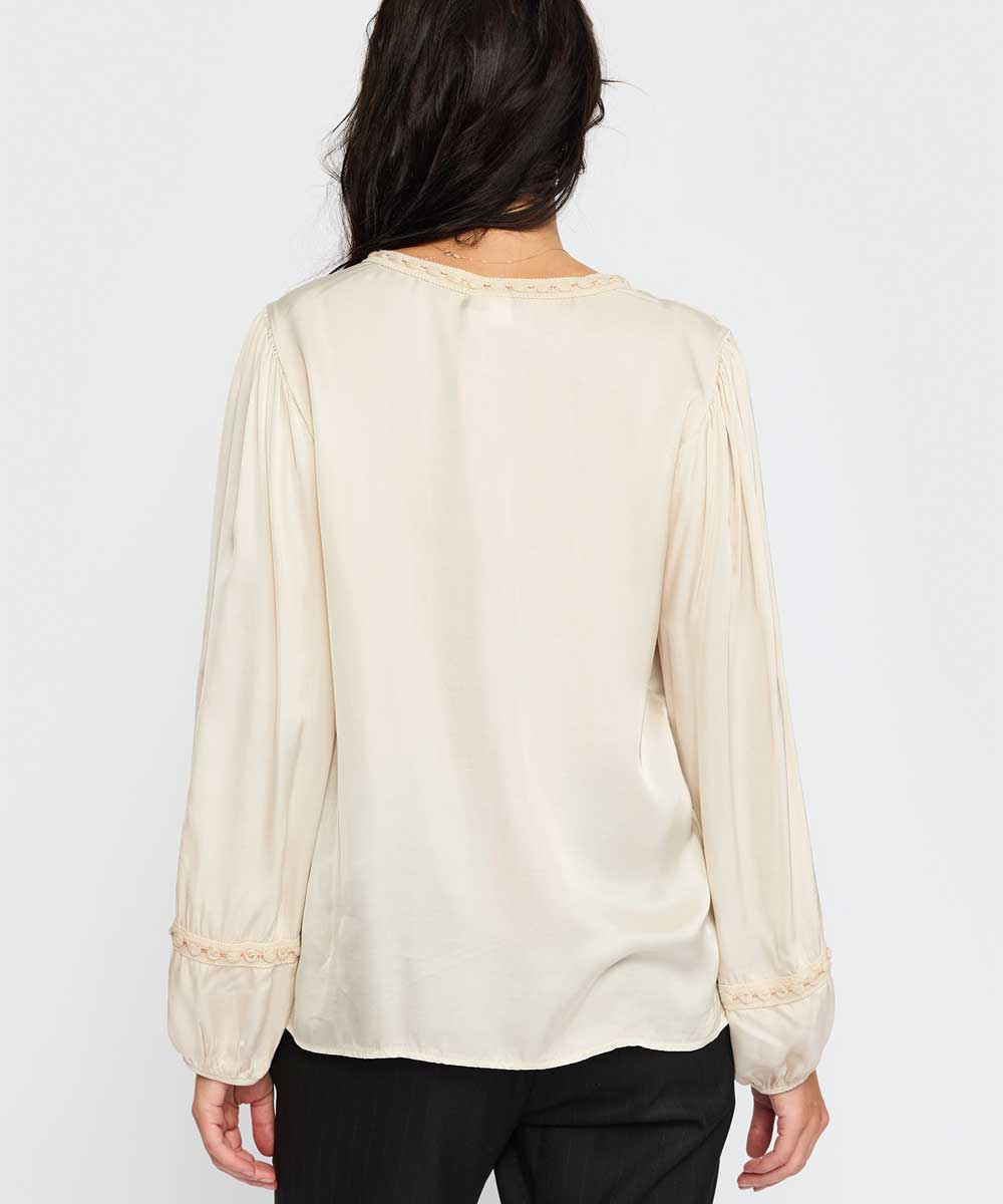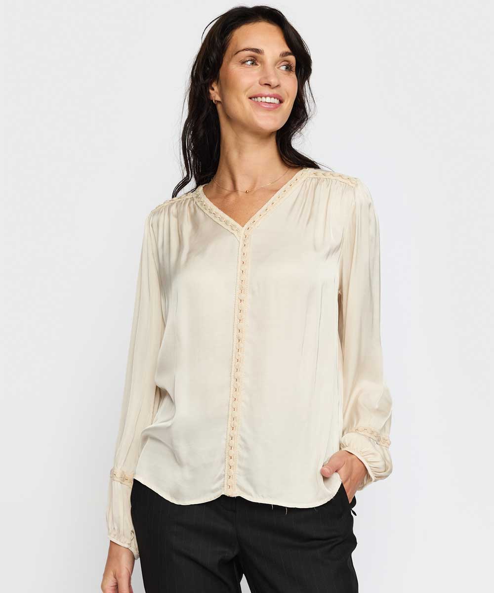 Camilla är en elegant blus från 2-Biz. Blusen har långa ärmar med resår vid ärmsluten, V-ringning och guldfärgade banddetaljer.