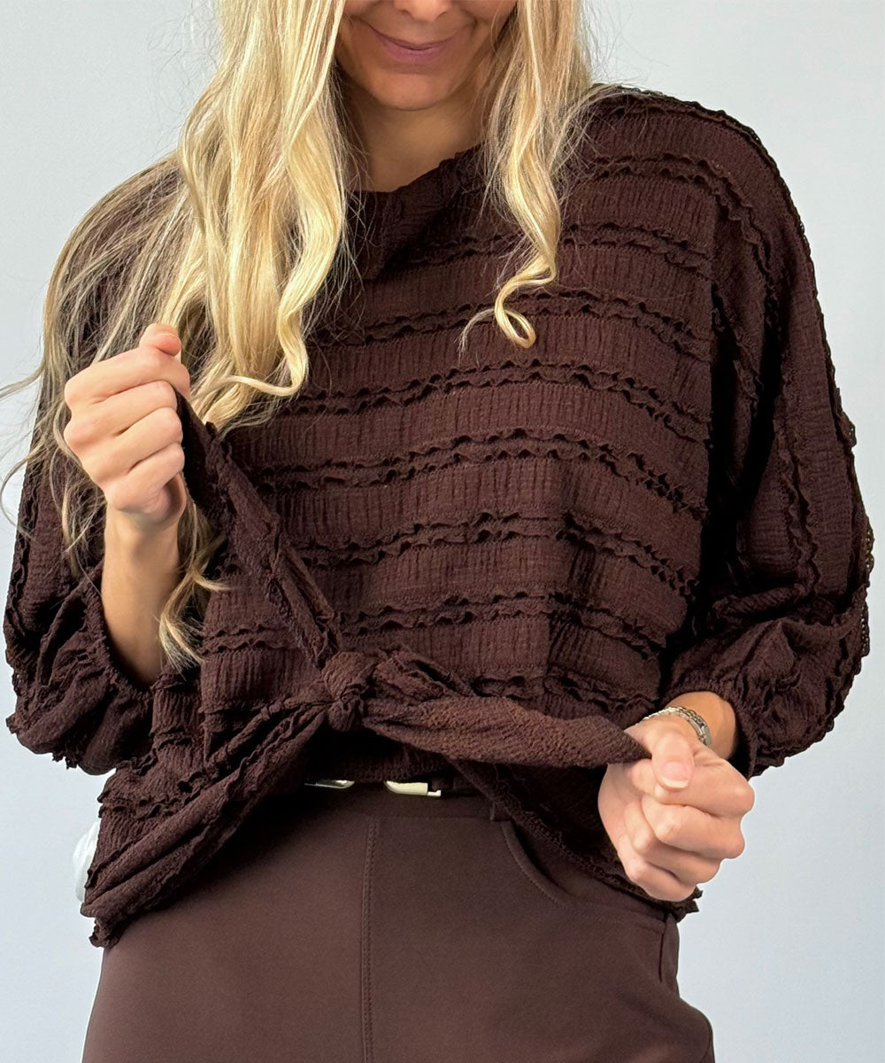 Dessi är en mjuk topp med fin struktur från Chica London, Toppen har rund halsringning, 3/4 ärmar med resår vid ärmsluten och en rak passform med knyt framtill.