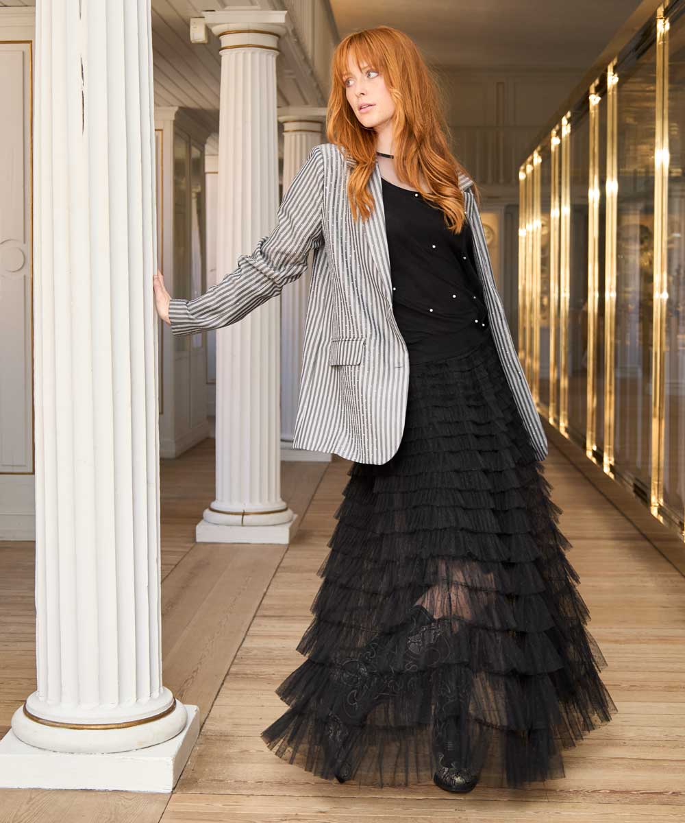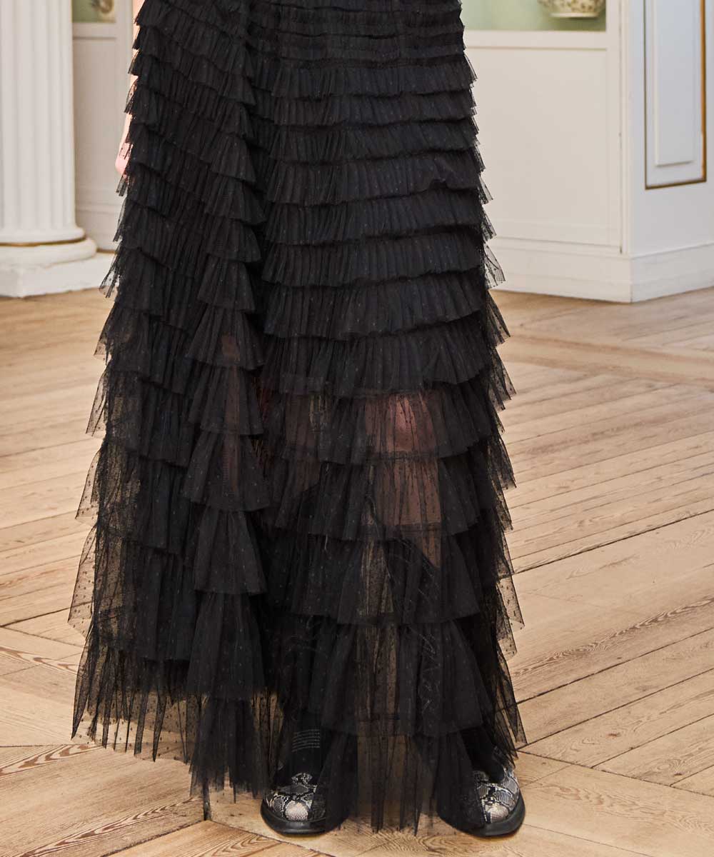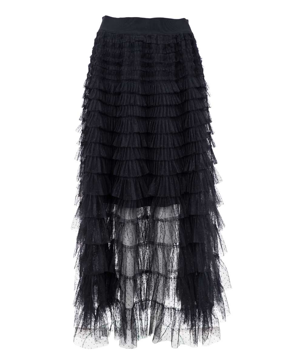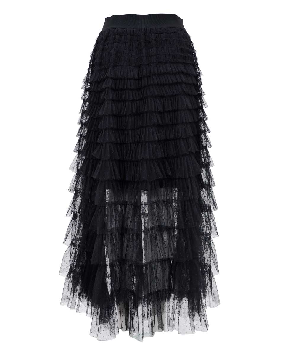 Angelina är en hellång kjol l i mesh med små prickar från Black Colour. Kjolen har resår i midjan och en lager-på-lager effekt med transparens nertill.