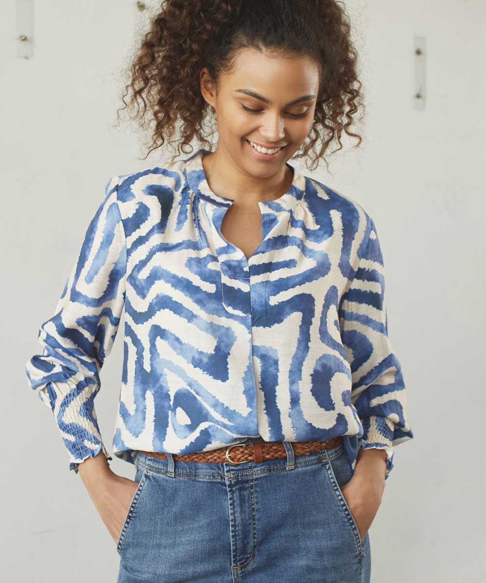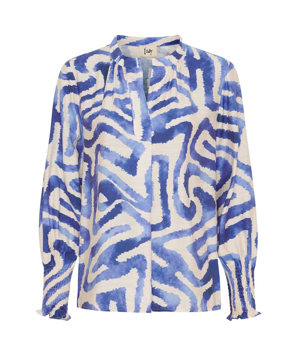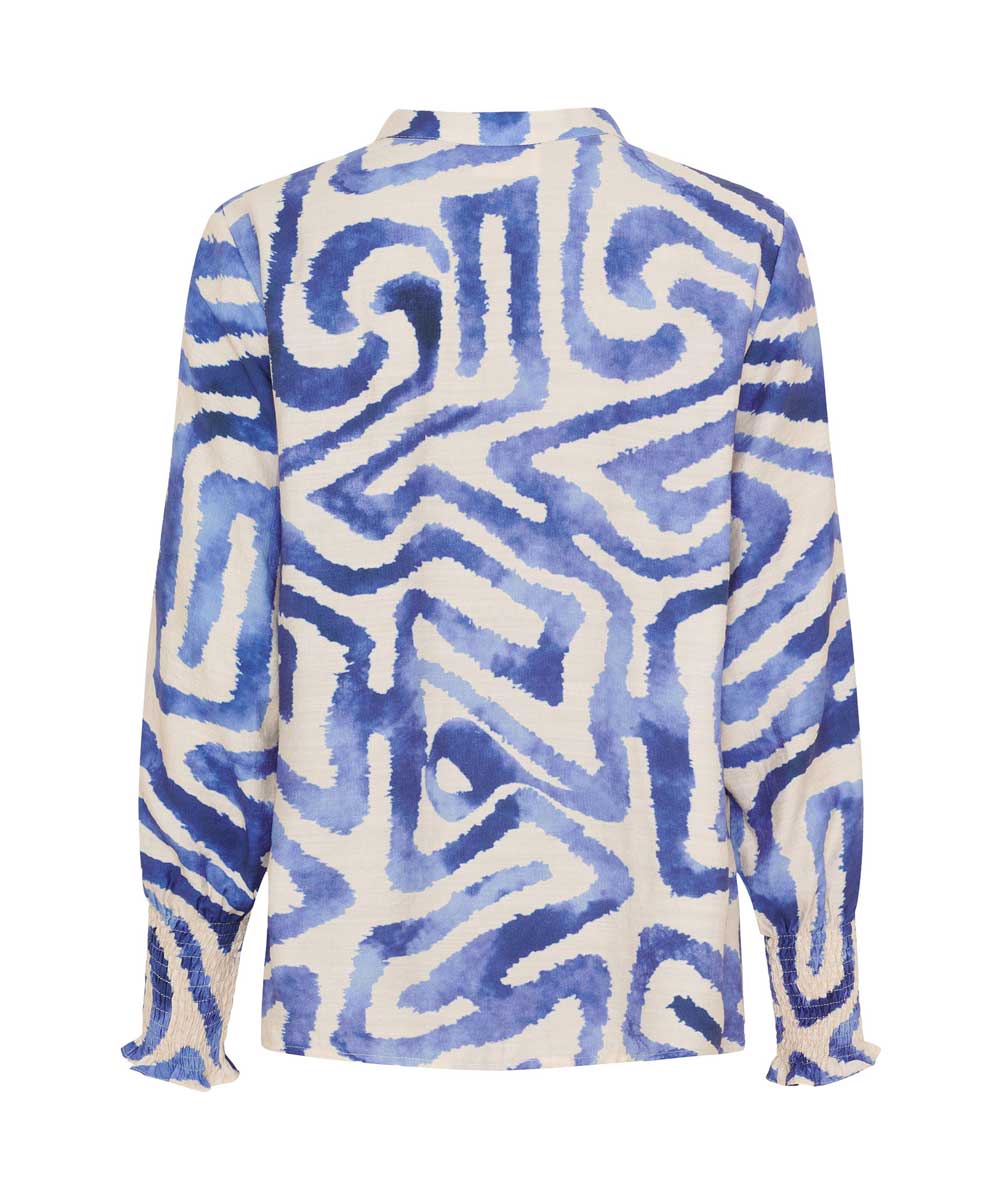 Ane är en elegant blus med en modern tryck och vackra, feminina detaljer från Isay. Den har en liten ståkrag, knappslå framtill som är dekorerad med fina veck, långa ärmarna som avslutas med elastisk smockning som ger både komfort och en raffinerad finish. Passformen är lös.