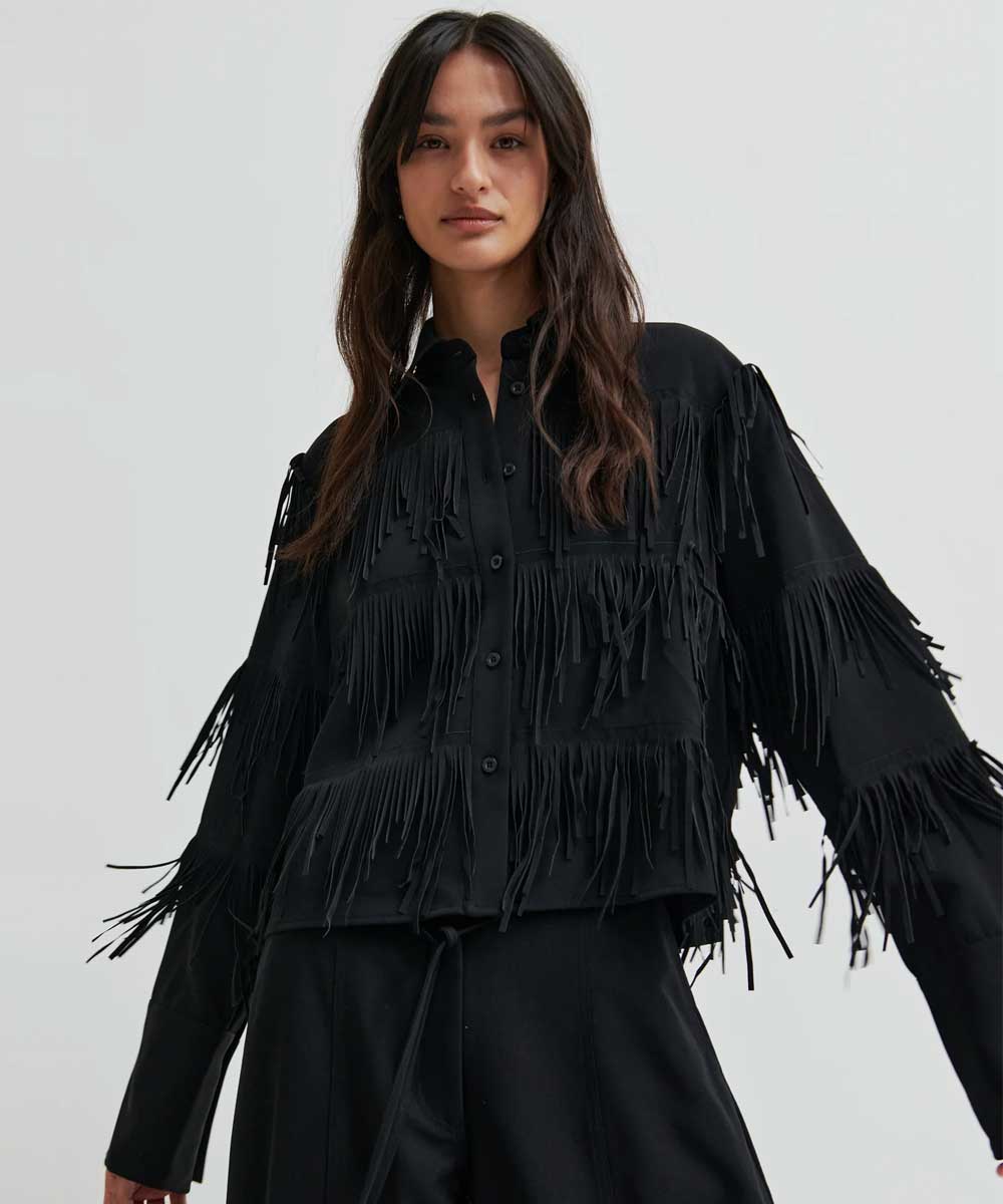 Dancing är en cool skjorta med fransar från Second Female. Skjortan är gjord i ett lätt tyg med ton-i-ton fransar på kropp och ärmar, skjortkrage och knäppning fram. Långa ärmar med breda manschetter med knappar. Rak siluett.