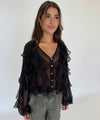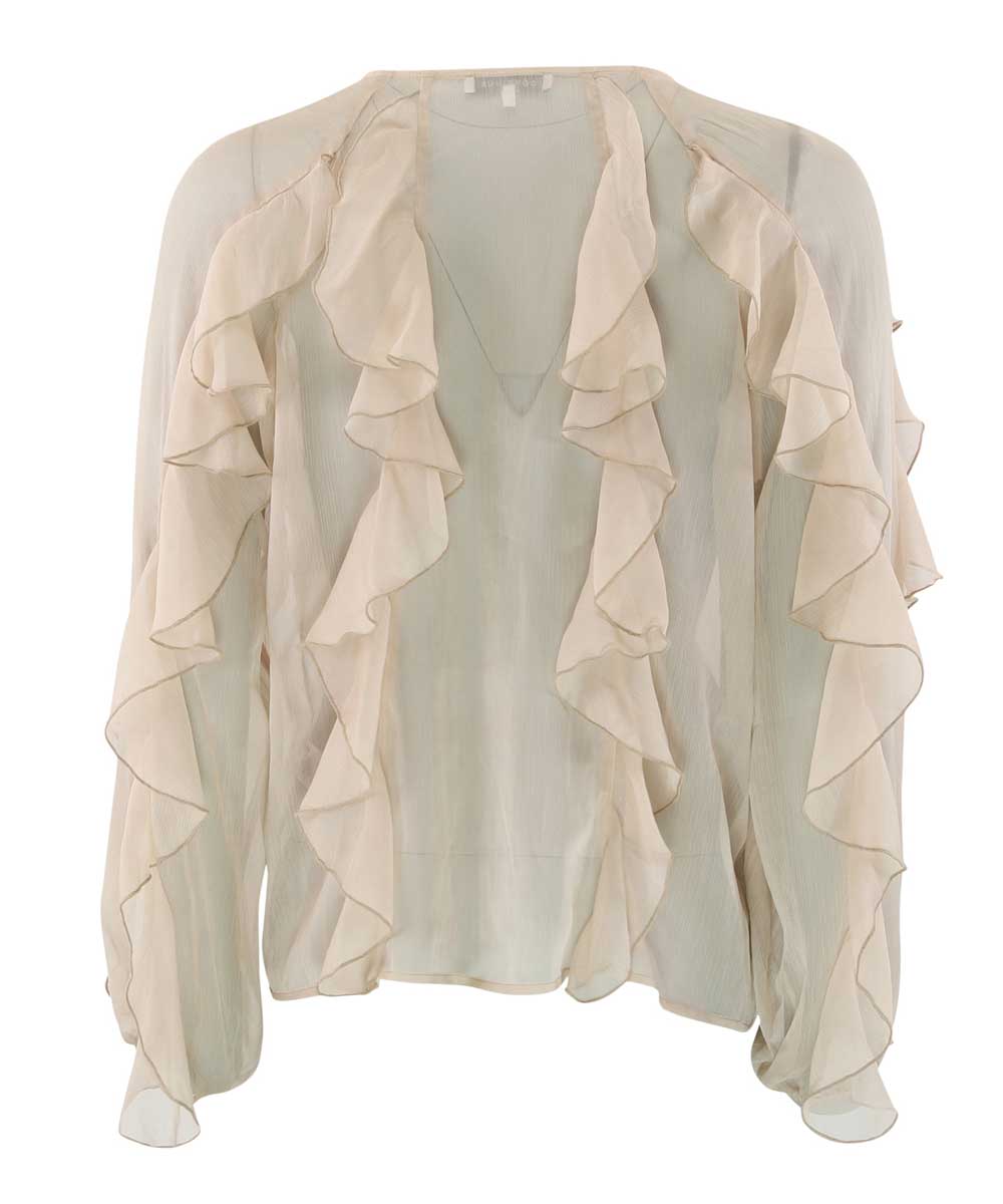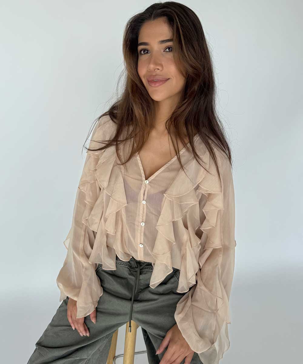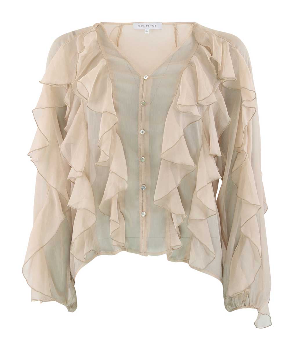 Lissa är en fin blus från Continue med transparent kvalitet. Blusen har V-ringning, knappar fram, långa ärmar med volang samt volanger framtill. En lös och avslappnad passform.