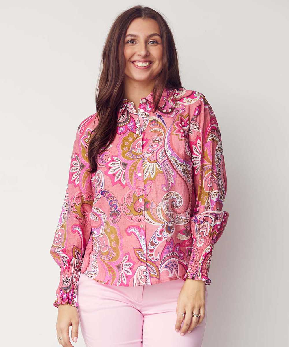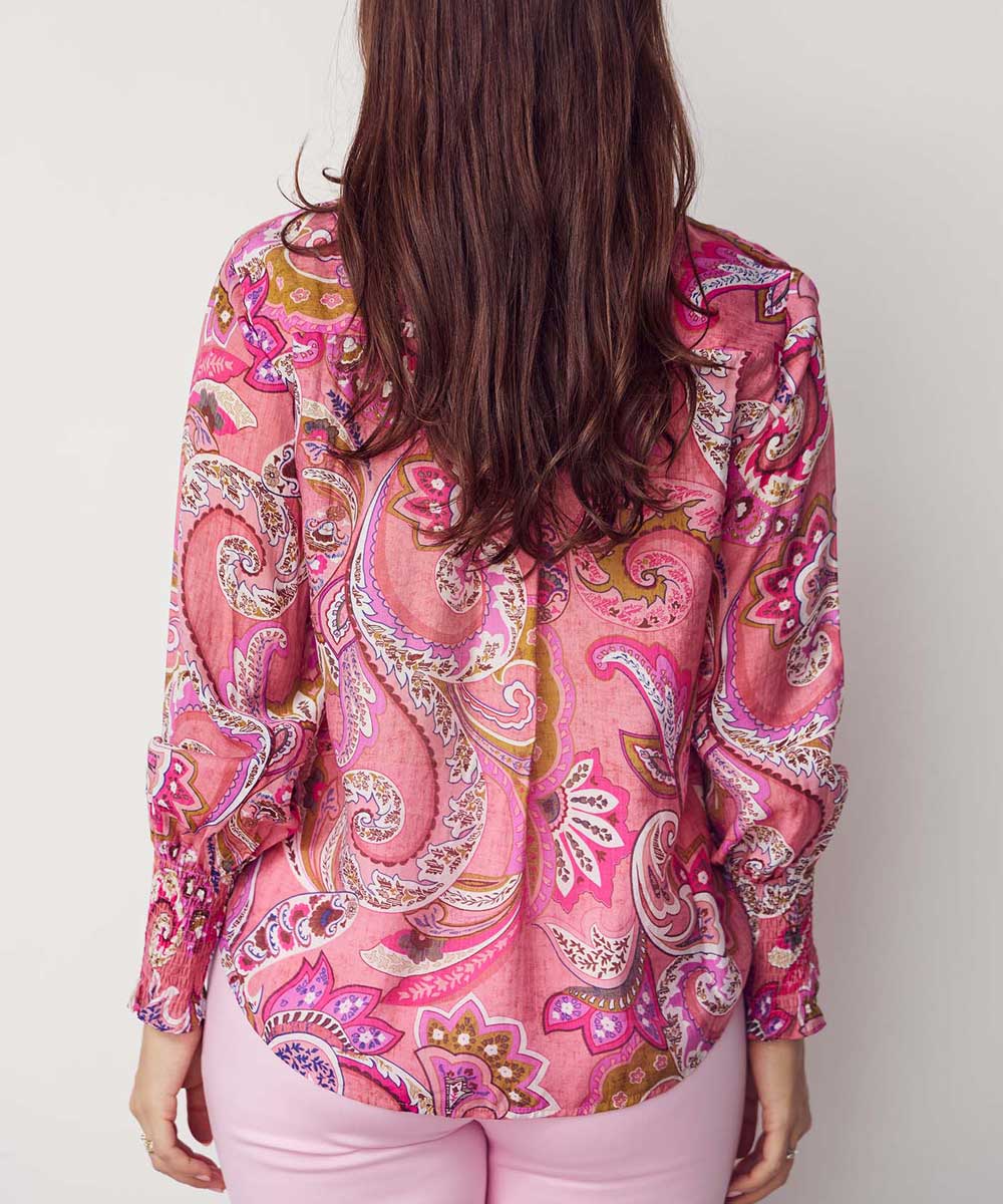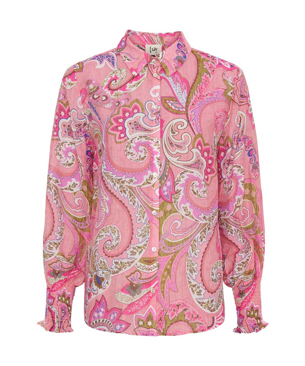 Lotta är en feminin och luftig blus med en vacker drapering och en bekväm silhuett från Isay. Blusen har en avslappnade passform som kombineras med klassiska detaljer som skjortkrage och knappstängning framtill. Långa ärmarna med elastisk smock och en liten rynkkant vid ärmsluten. Lätt genomskinligt som känns mjuk mot huden och faller vackert runt kroppen.
