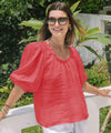 Mickis är en fin linneblus från Chica London. Blusen har rund halsringning som kantas av volang och härliga korta puffärmar. En rak skön passform.