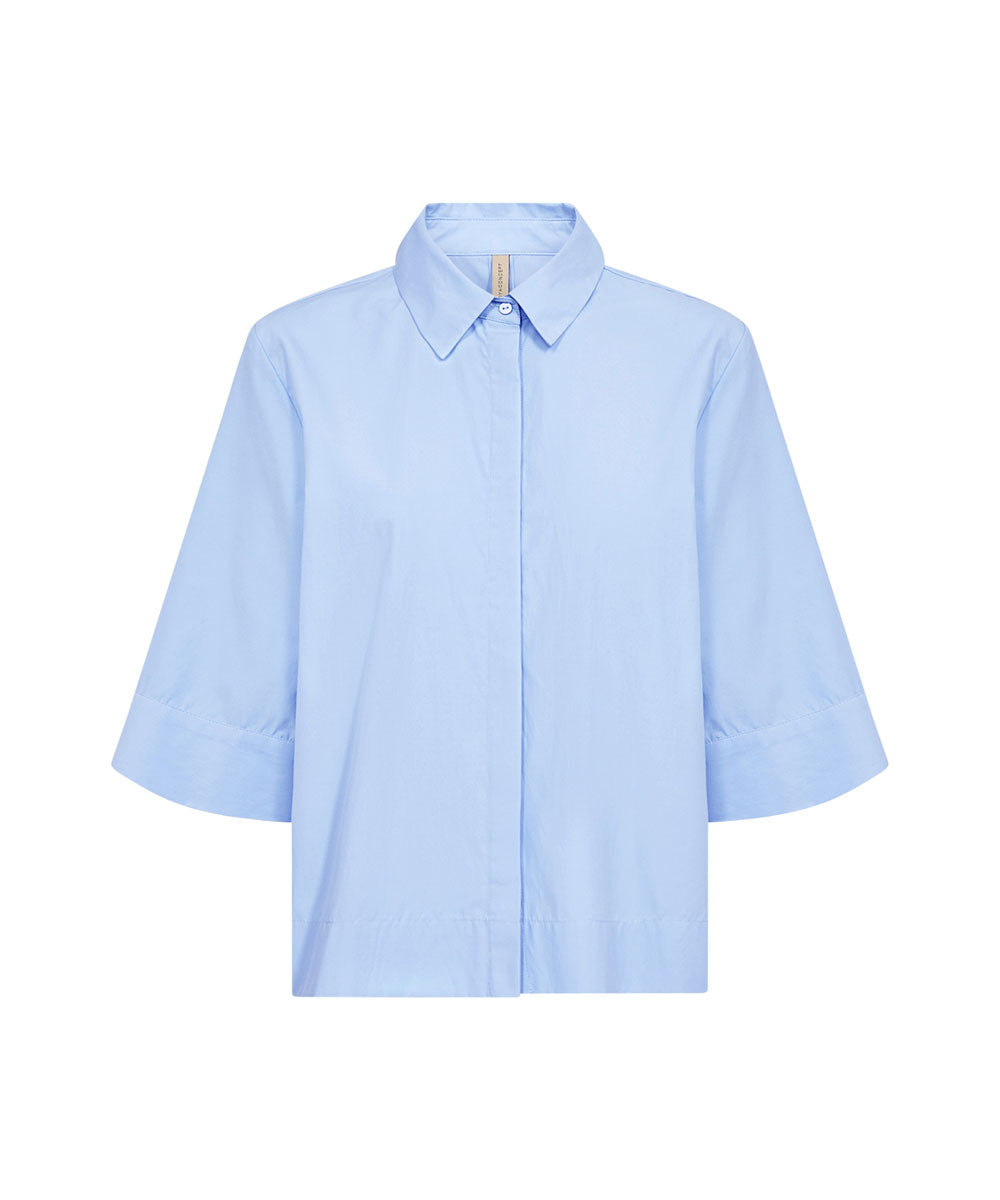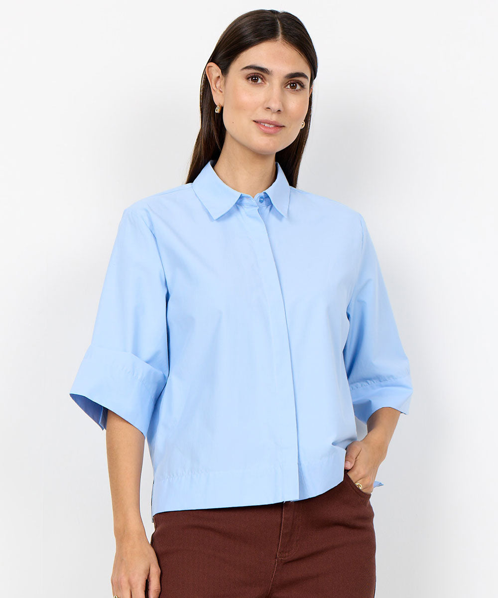 NETTI 118 är en cool skjorta från Soyaconcept. Skjortan har en klassisk krage, dolda knappar och en rak fåll samt halvlånga vida ärmar. Kombinera den med skräddarsydda byxor eller en ledig kjol för en elegant stil.