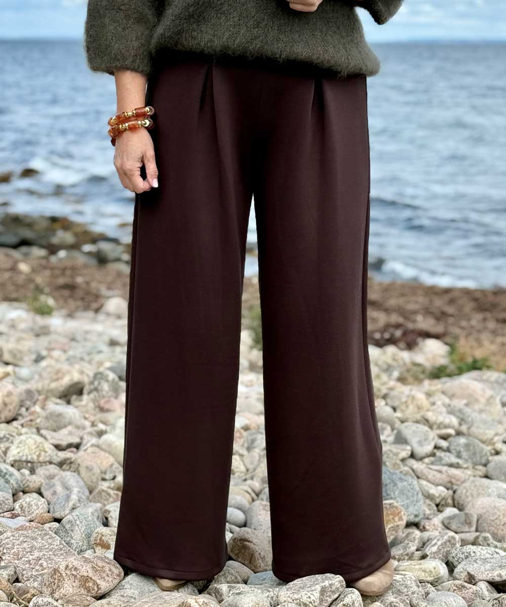 Blue är en härlig mjukisbyxa med snygg design från Ezence. Byxorna har skön resår i midjan, sydda veck upptill fram och raka vida ben. Byxorna kommer i storlek onesize och passar mellan storlek 36-42.