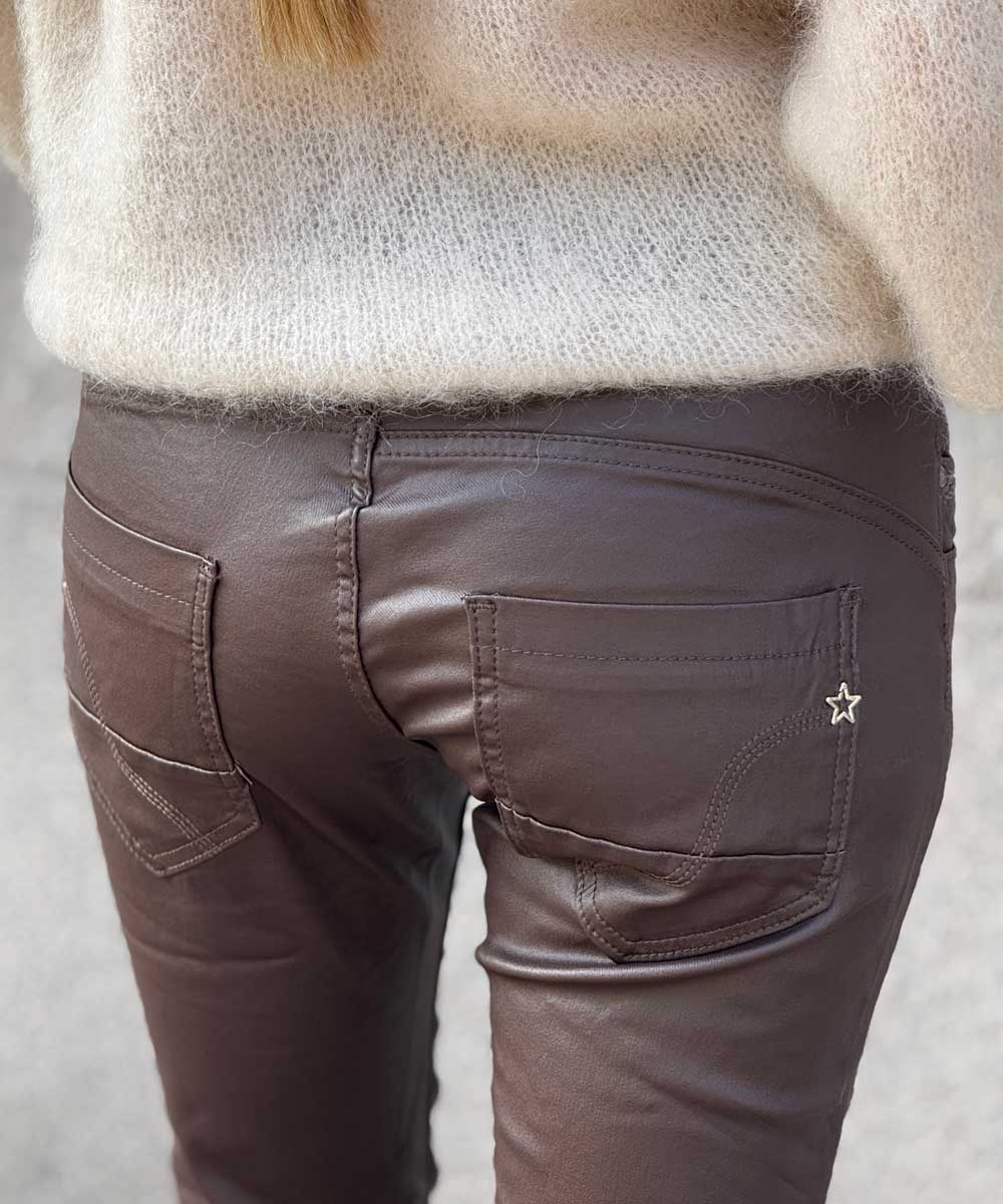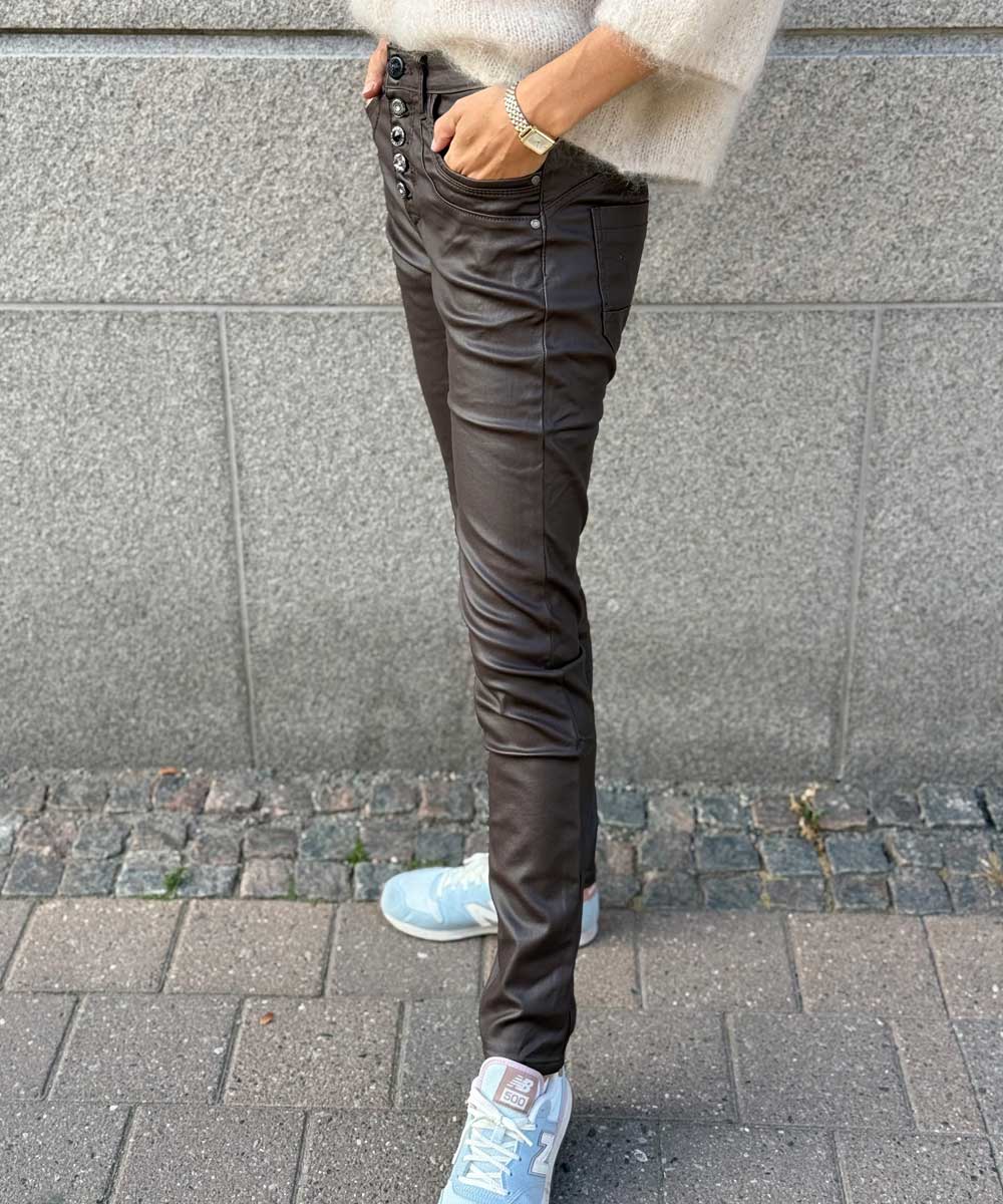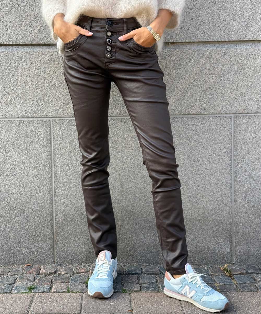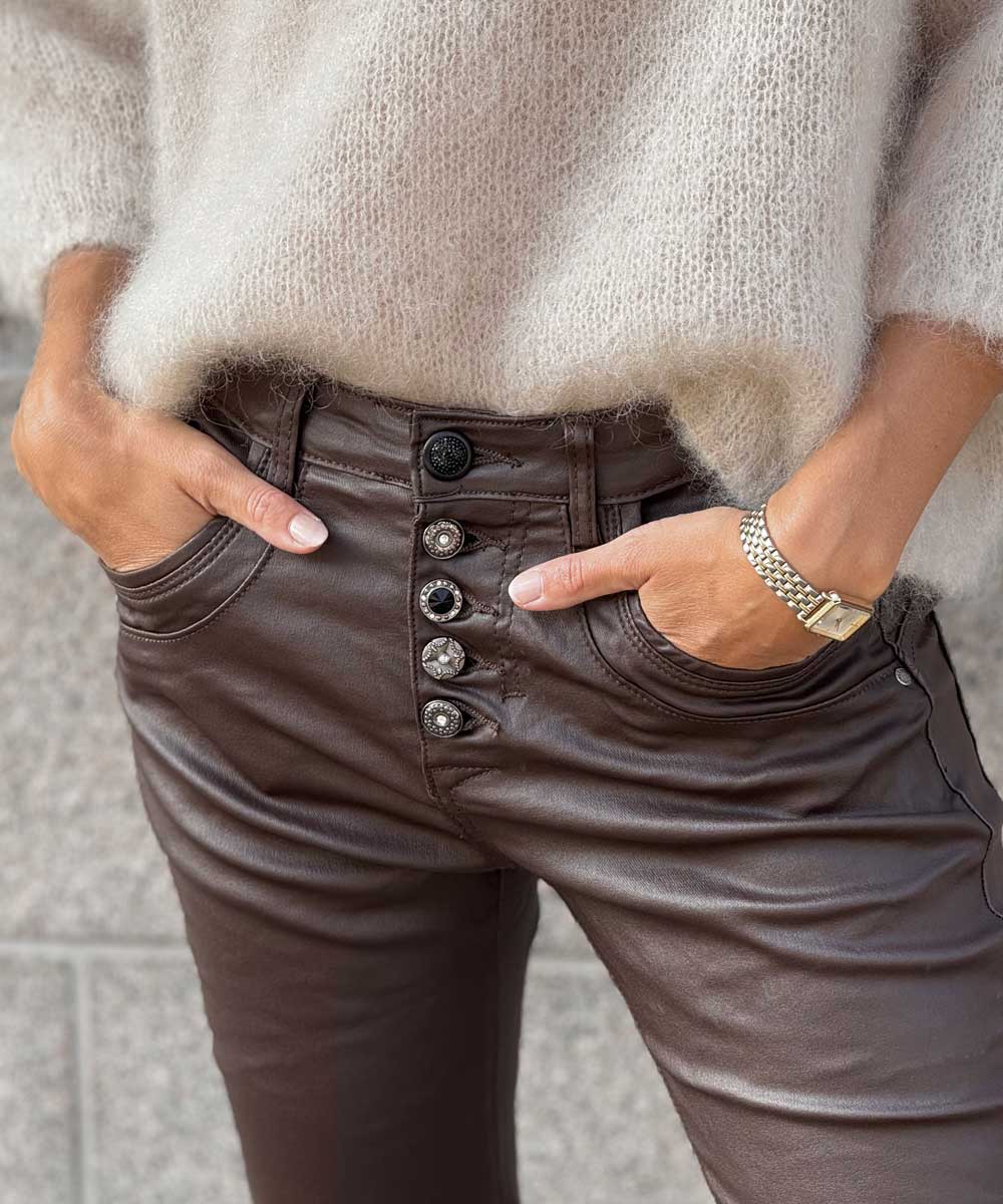 Mjuka och sköna byxor med mycket stretch från Chica London. Byxorna har rak smal passform och en cool vaxad yta samt fickor fram och bak. Knäpps med snygga glitterknappar.