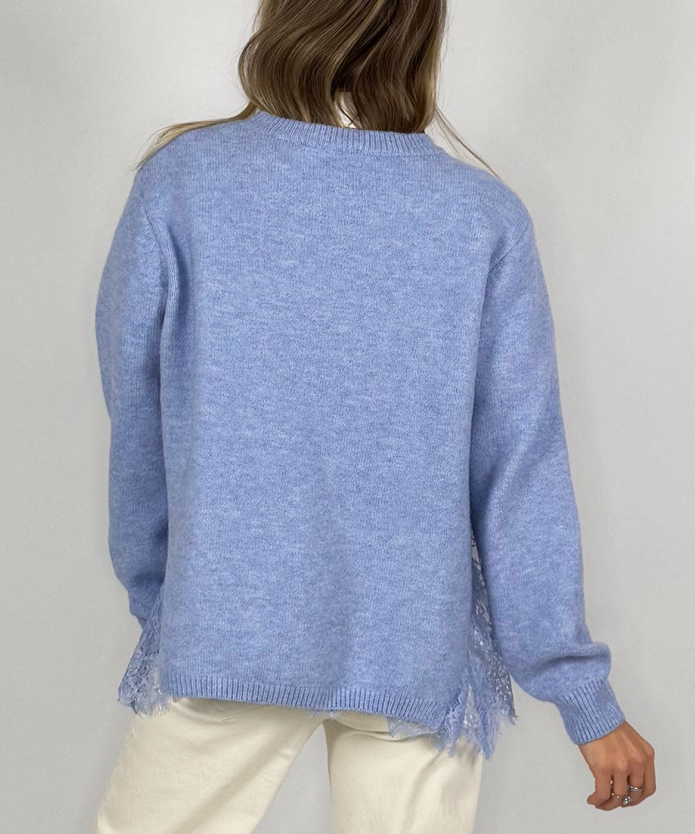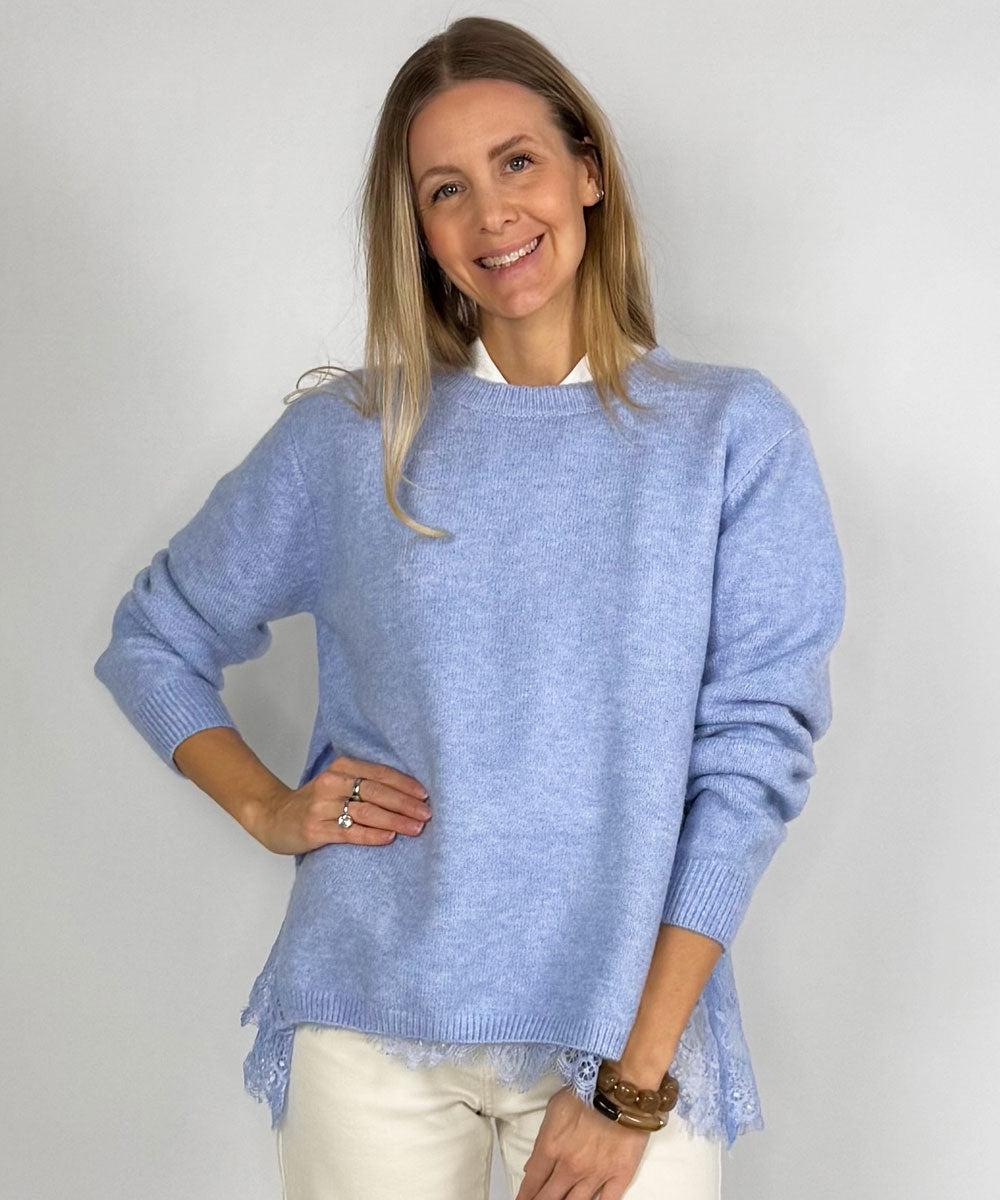 Fanny är en härlig stickad tröja i blått från Chica London. Tröjan har rund halsringning, långa ärmar med mudd vis ärmsluten och en rak passform med slitsar i sidorna. Fastsytt linne i spets som blir en fin detalj i sidorna och nertill.