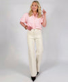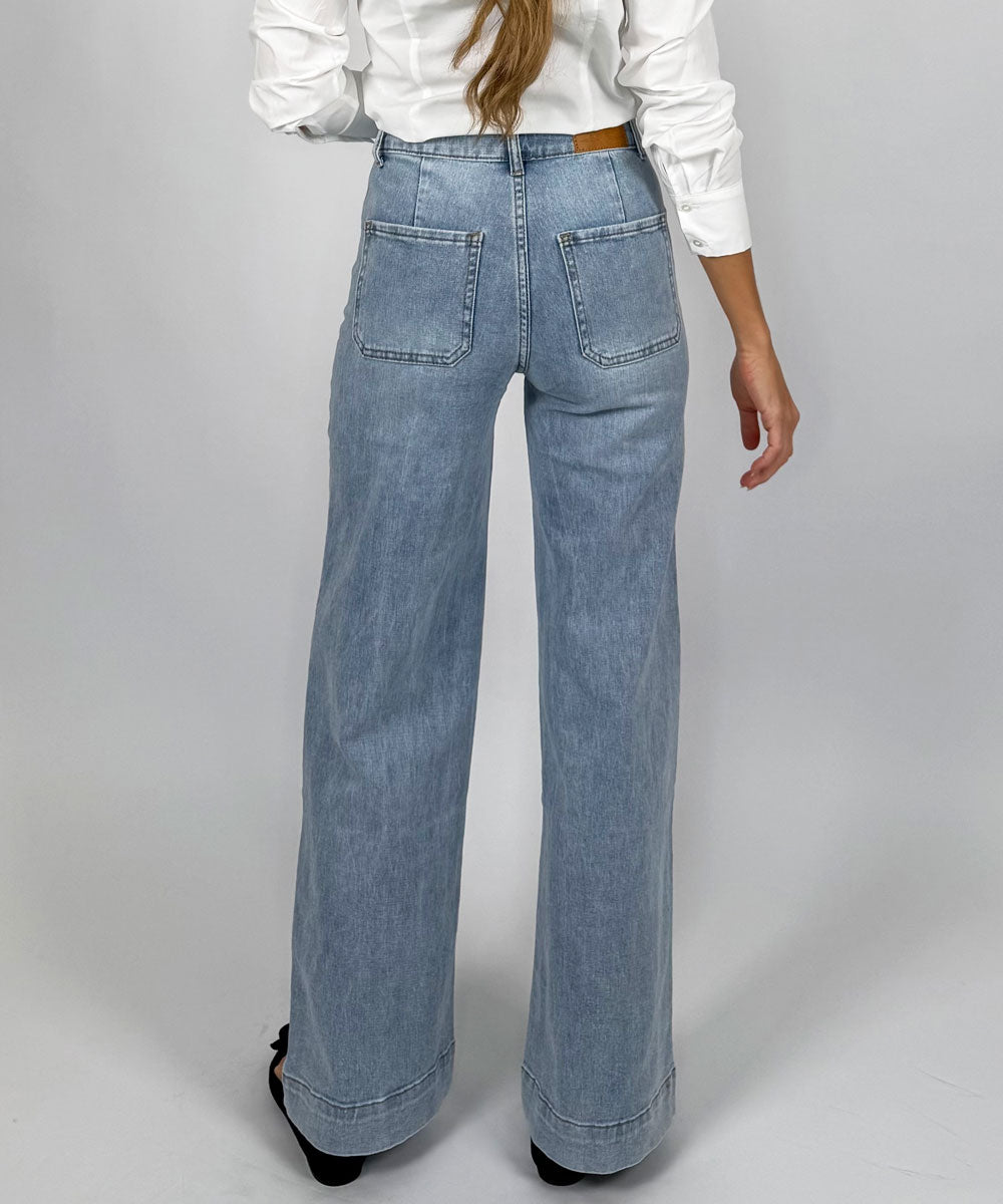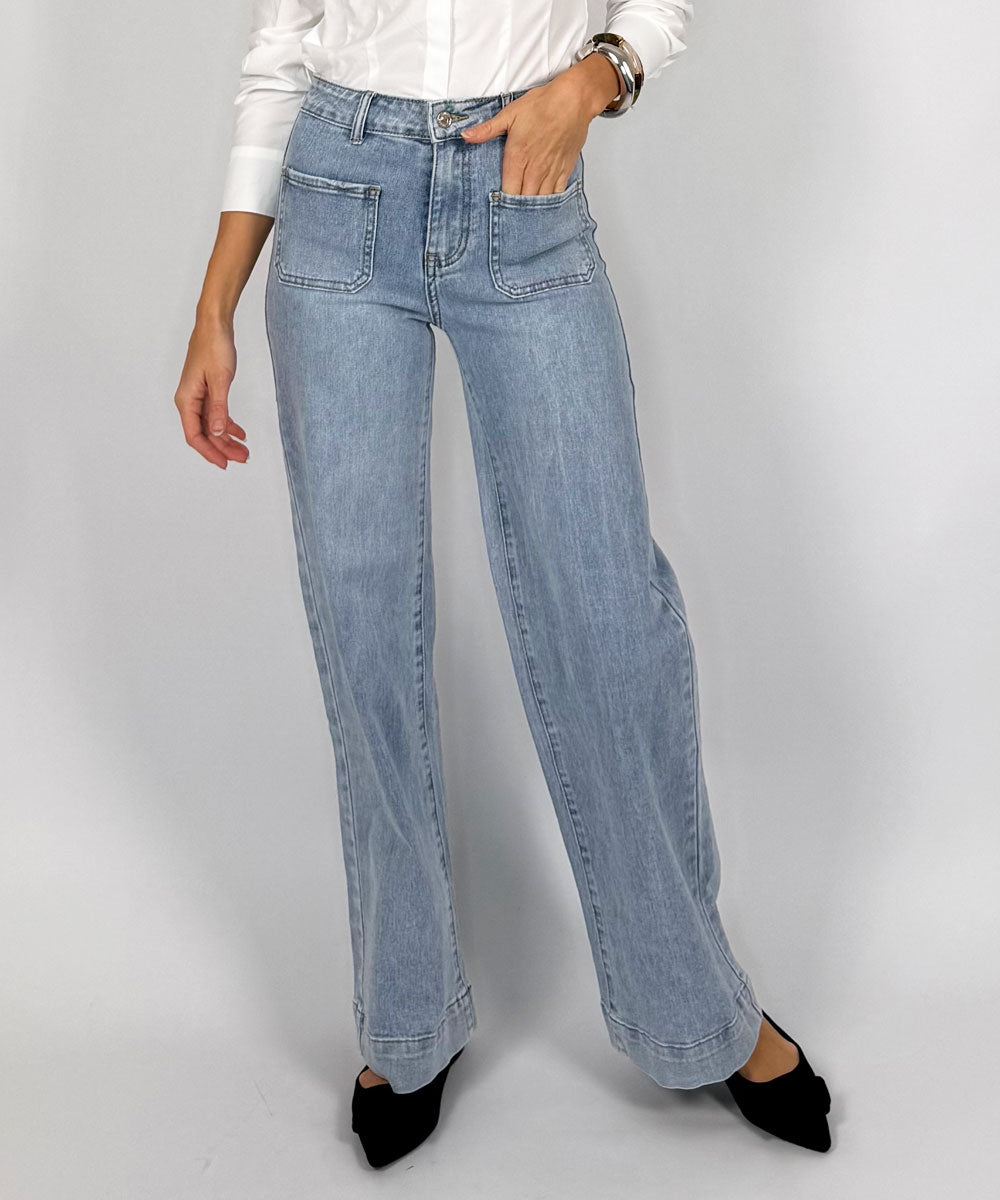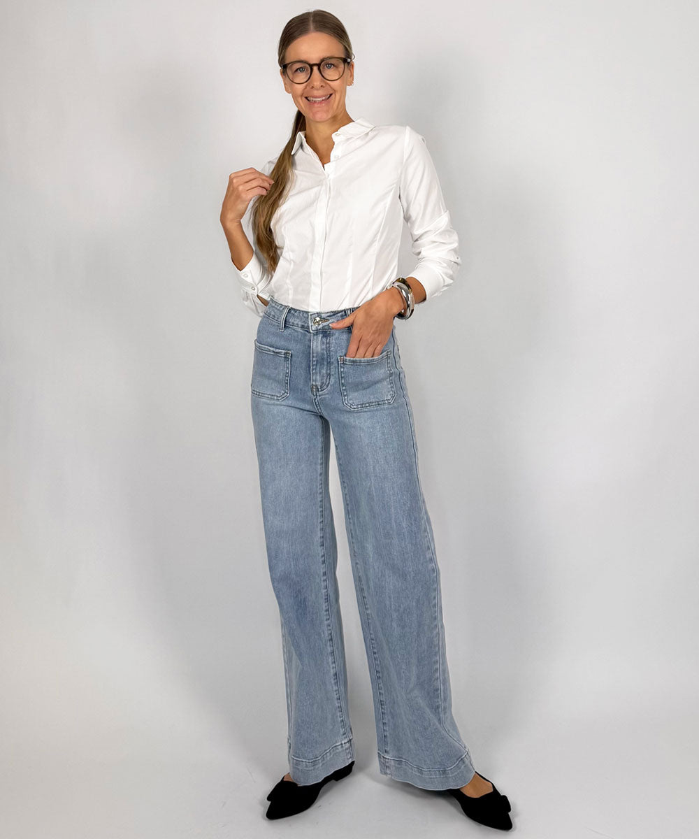 Härlig jeans med stretch från Chica London. Jeansen har utanpåliggande fickor fram, gylf och dragkedja samt vida ben.