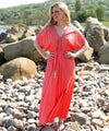 Annie är en härlig och skön maxiklänning från Cosy House. Klänningen har v-ringad hals som kantas av guldband och knytband, korta vida ärmar, resår i midjan och slits nertill.