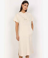 BANU 232 är en avslappnad klänning från Soyaconcept, tillverkad i en bekväm blandning av 48% modal, 48% polyester och 4% elastan. Klänningen har en huva med dragsko, en känguruficka framtill och en avslappnad passform med en längd mitt på låret.