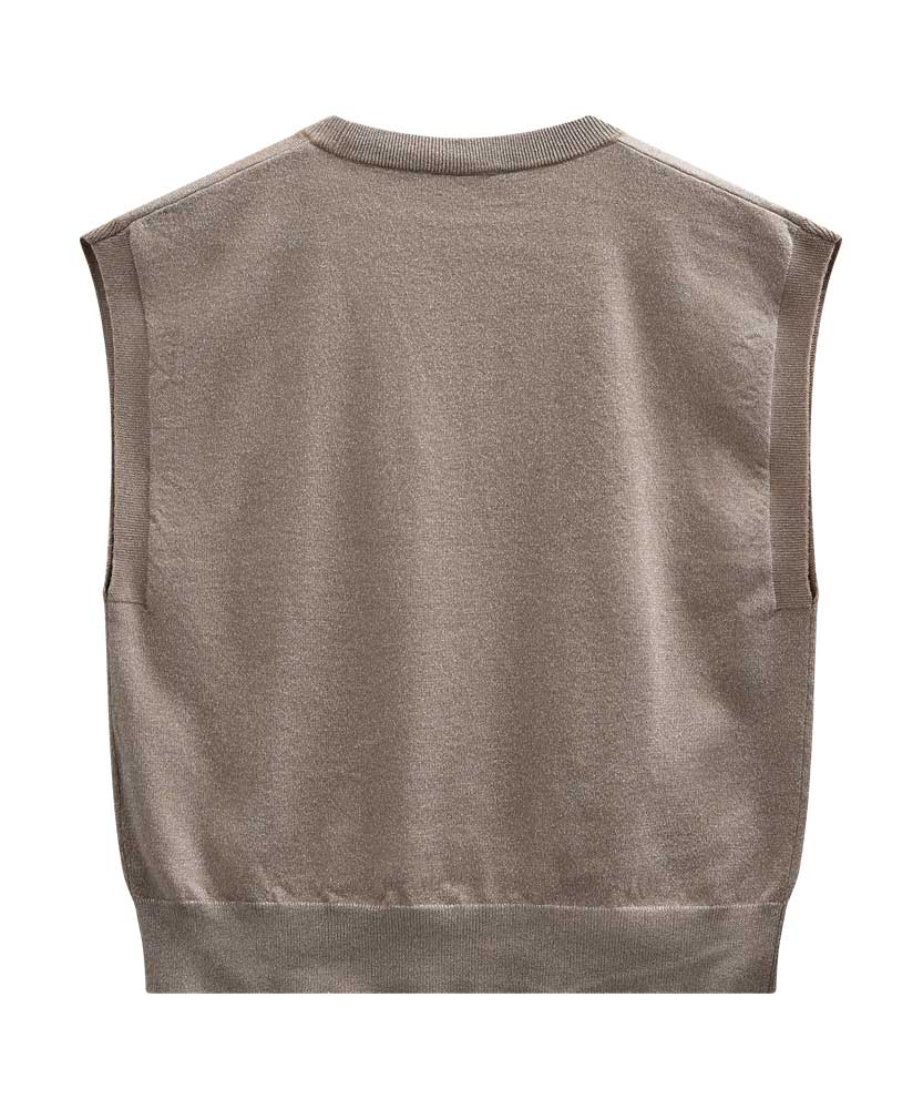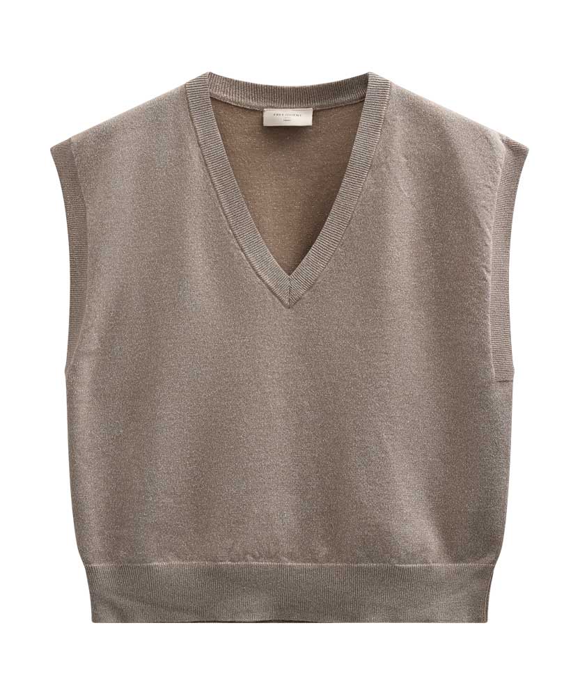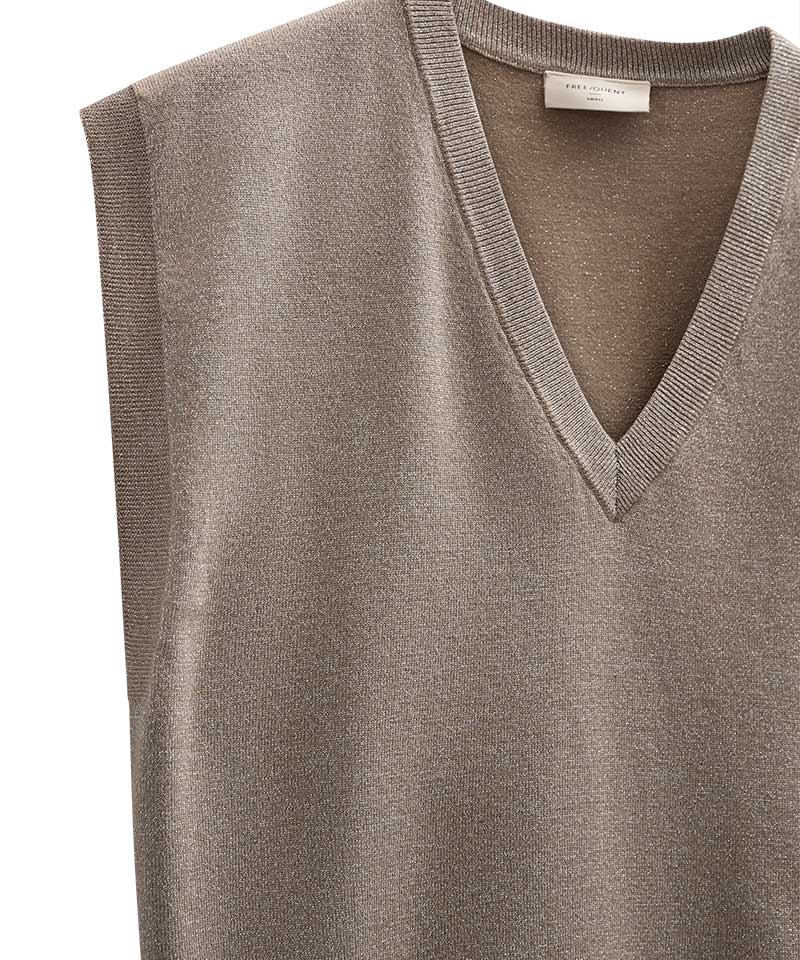 Bisola är en finstickad väst från Freequent. Västen är silverglittrig, har v-ringad hals, ribbade muddar och en rak enkel passform.