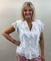 Jane är en fin blus från Mix By Heart. Blusen har knappar fram, volanger längs urringningen och över axlarna och ett något transparent tyg.