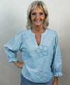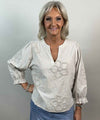 Melanie är en blus med fina detaljer från Mix By Heart. Blusen har V-hals, ärmar med vidd och smal resår vid ärmsluten, härligt brodyrmönster och en rak enkel passform.