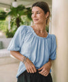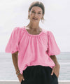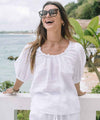 Mickis är en fin linneblus från Chica London. Blusen har rund halsringning som kantas av volang och härliga korta puffärmar. En rak skön passform.