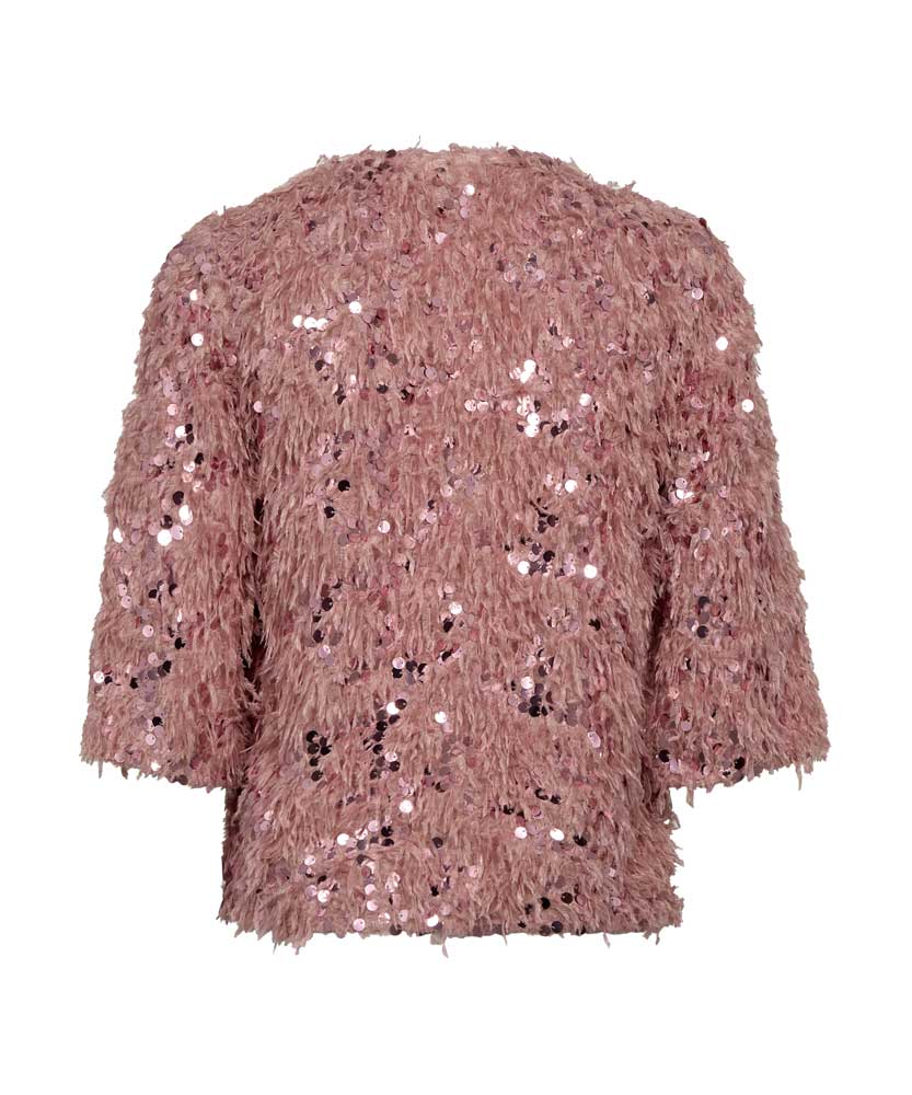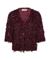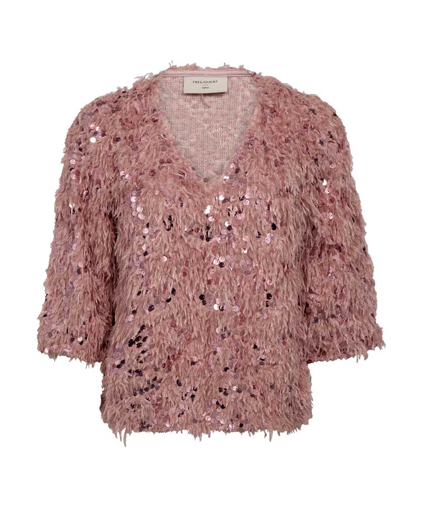 Nolla är cool blus med fransig struktur från Freequent. Blusen är täckt av små fransar och paljetter, har v-ringad hals och halvvlånga ärmar. Normal passform. Superfin till både kjol och byxor.