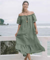 Signe är en härlig linneklänning i offshoulder modell från Ezence. Klänningen har fin volangkant upptill, korta ärmar, bred volangkant nertill och en lös skön passform.