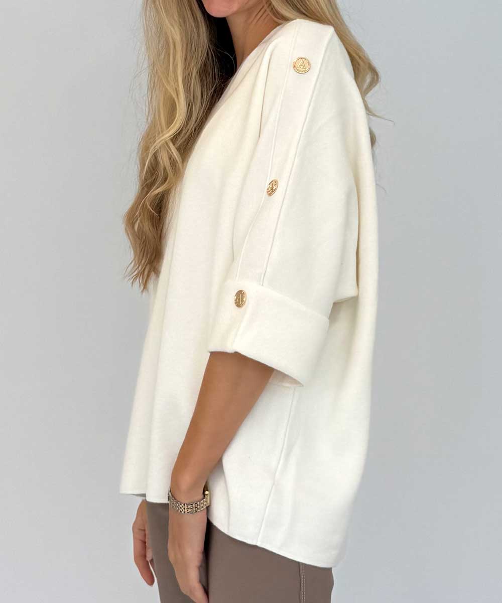 Härlig stickad tröja från Chica London. Tröjan har v-ringad hals med ribbstickad kant, 3/4 vida ärmar med fina guldknappar och en rak lös passform.