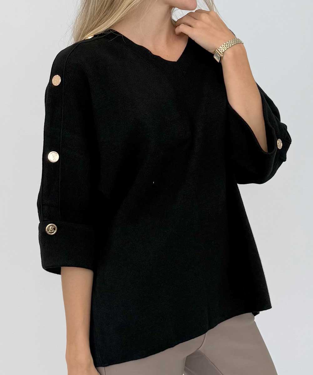 Härlig stickad tröja från Chica London. Tröjan har v-ringad hals med ribbstickad kant, 3/4 vida ärmar med fina guldknappar och en rak lös passform.
