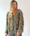 Fia är en superfin blus med volanger från Chica London. Blusen har ett lätt transparant tyg, v-ringad hals med knappar, långa ärmar med knapp vid ärmsluten och fina volanger längs ärmarna, fram och baktill. Rak enkel passform.