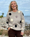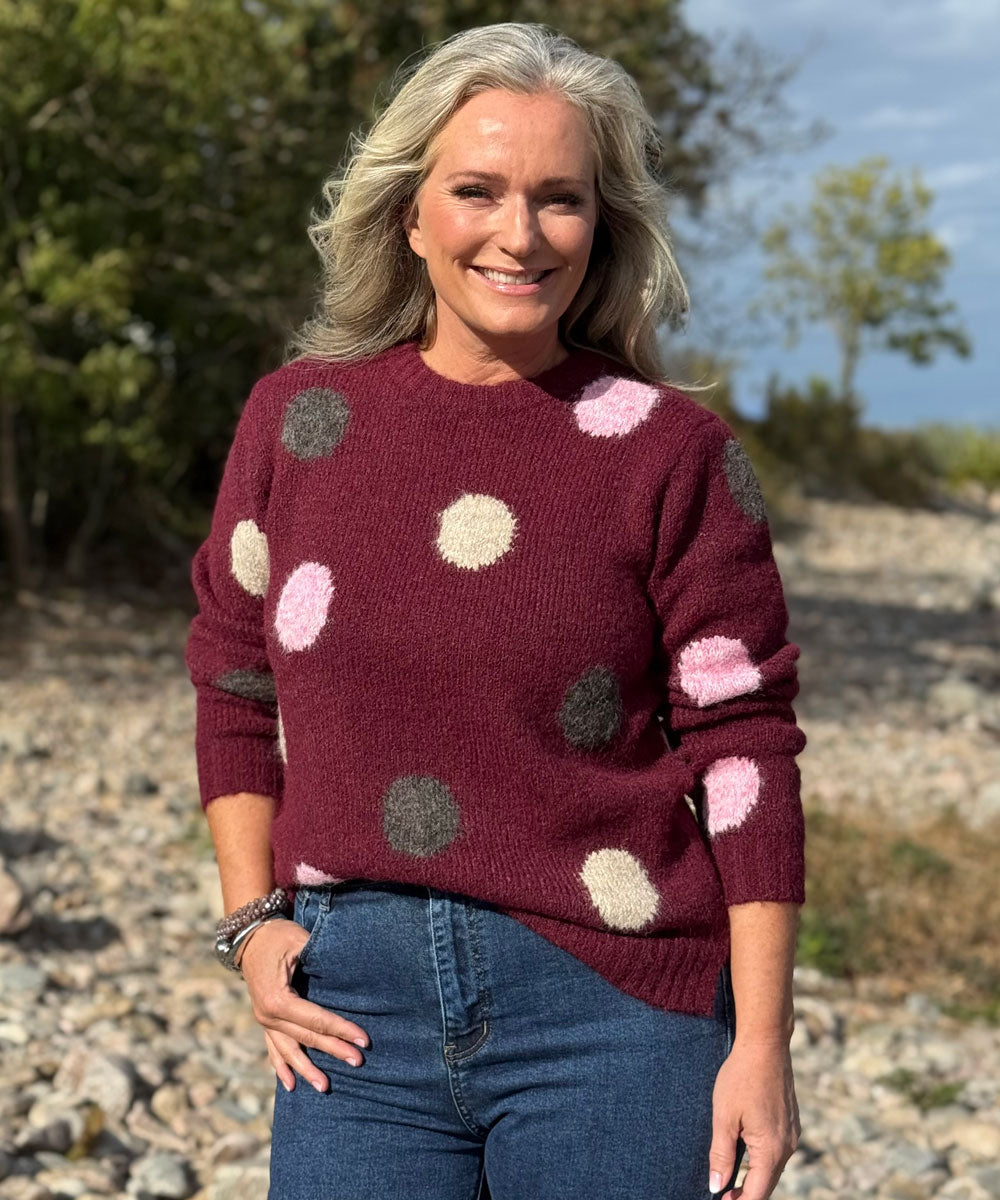Louisa är en stickad tröja från Freequent. Tröjan har rund halsringning, långa ärmar med ribbstickade muddar och slitsar i sidorna nertill. Tröjan har normal passform och ett fint mönster med stora prickar i olika nyanser.
