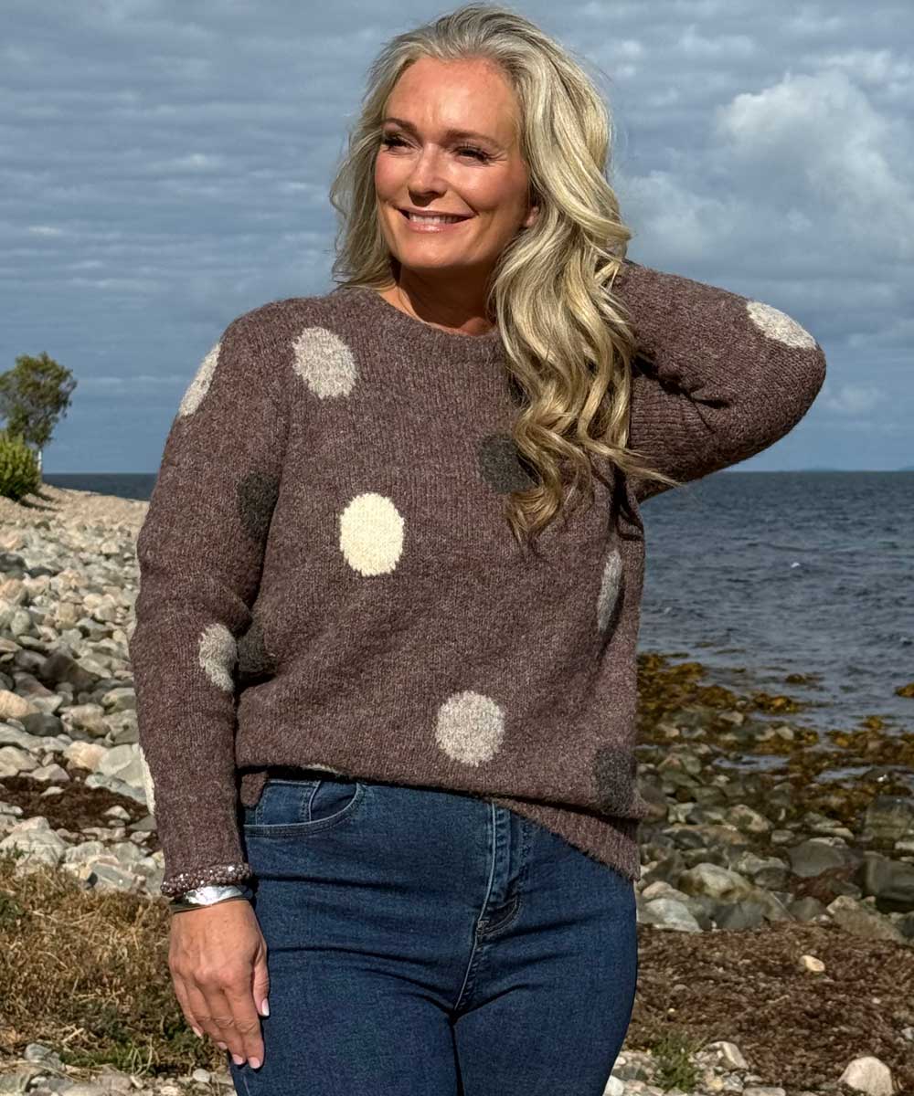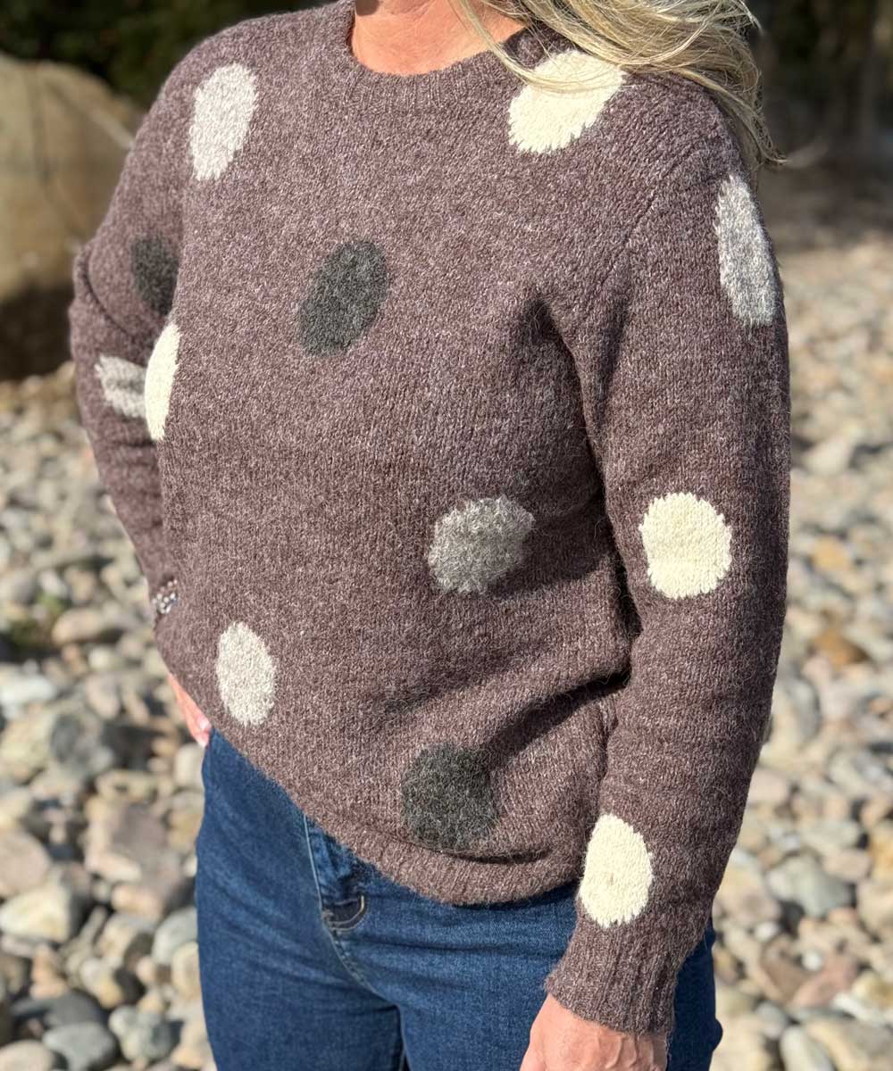 Louisa är en stickad tröja från Freequent. Tröjan har rund halsringning, långa ärmar med ribbstickade muddar och slitsar i sidorna nertill. Tröjan har normal passform och ett fint mönster med stora prickar i olika nyanser.