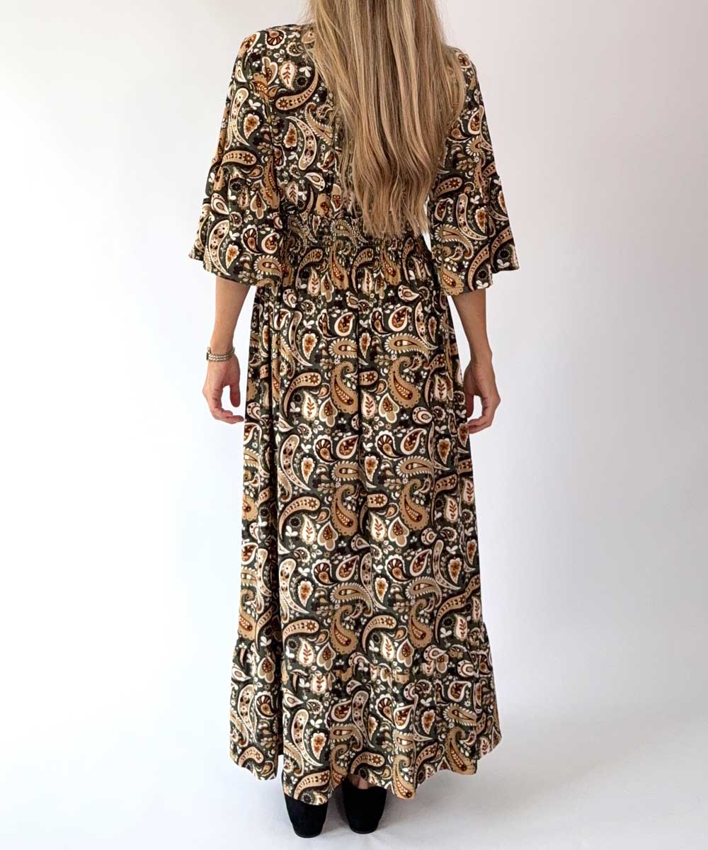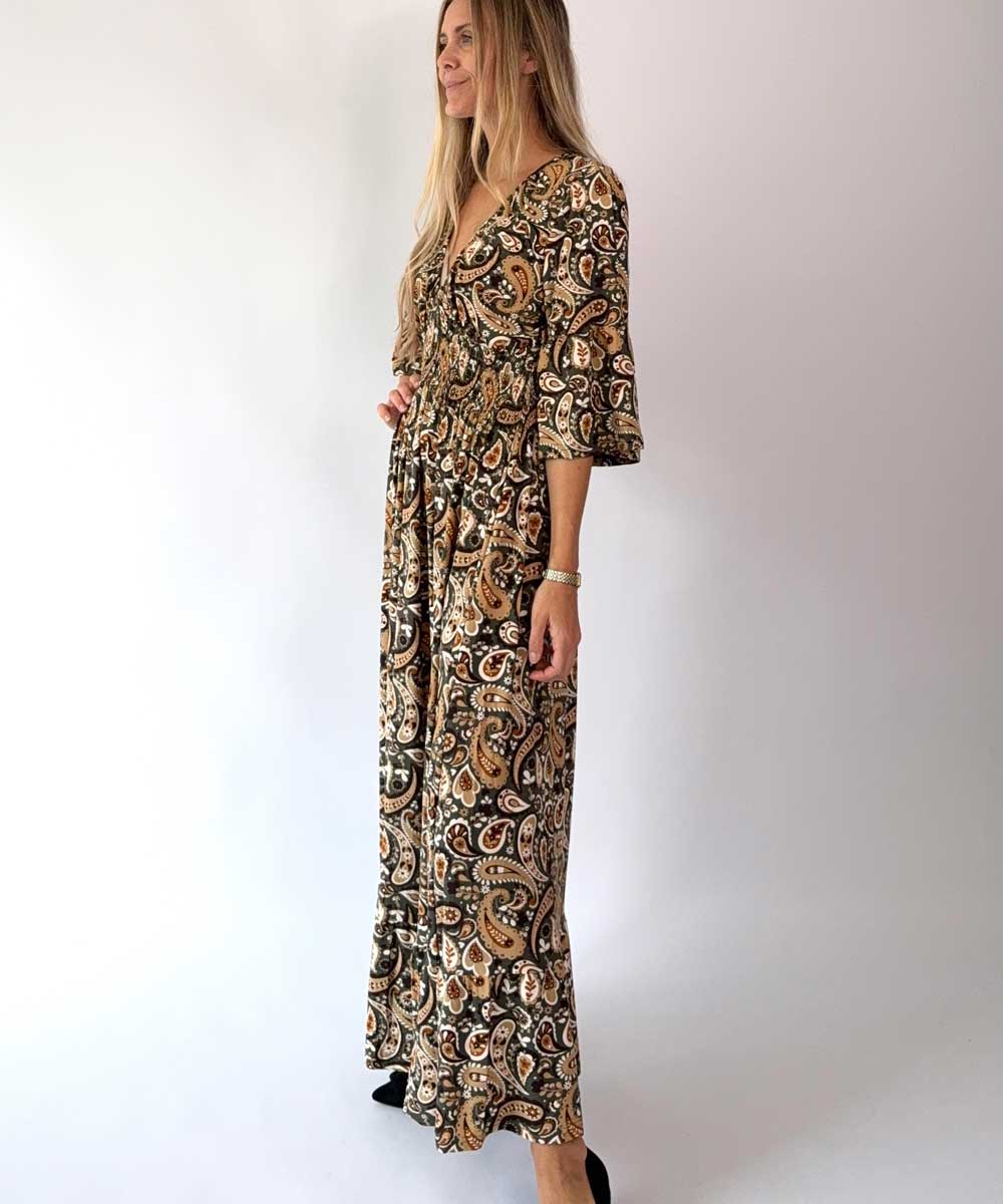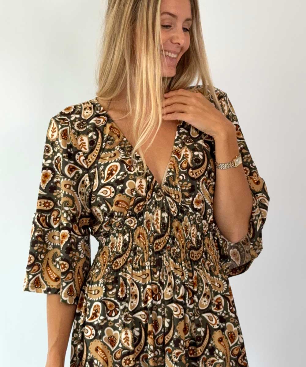 Nadia är en härlig mönstrad klänning i mjuk jersey från Chica London. Klänningen har v-ringad hals med resår, 3/4 vida ärmar och en lös skön passform.