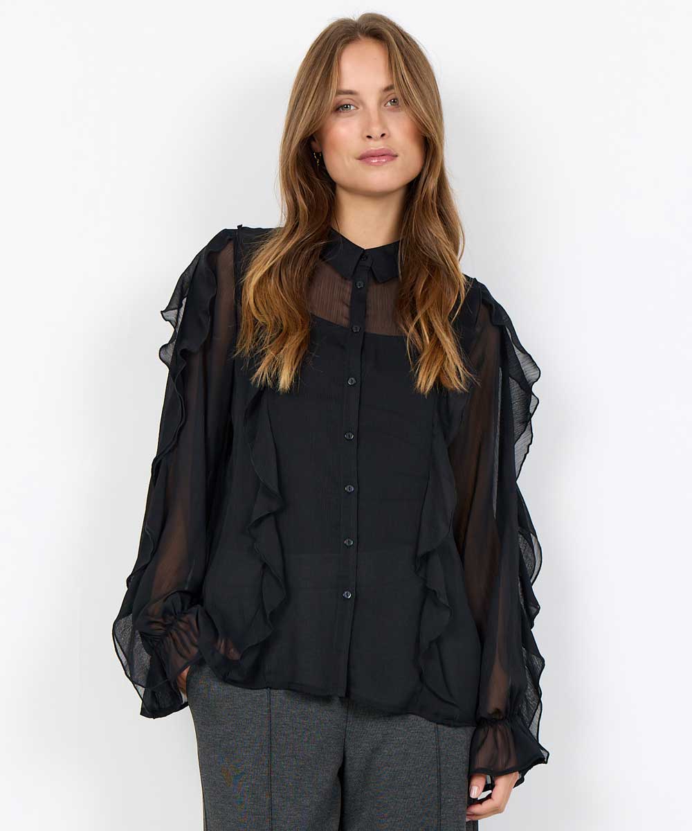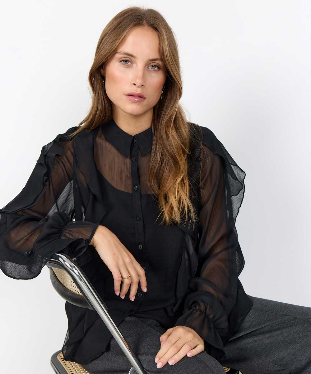 NAIA 5 är en vacker blus från Soyaconcept. Blusen har en klassisk skjortkrage, knappslå framtill, volangdetaljer och ett skirt strukturerat tyg. Matcha den fina blus med skräddarsydda byxor eller en elegant kjol för en fin festlook.
