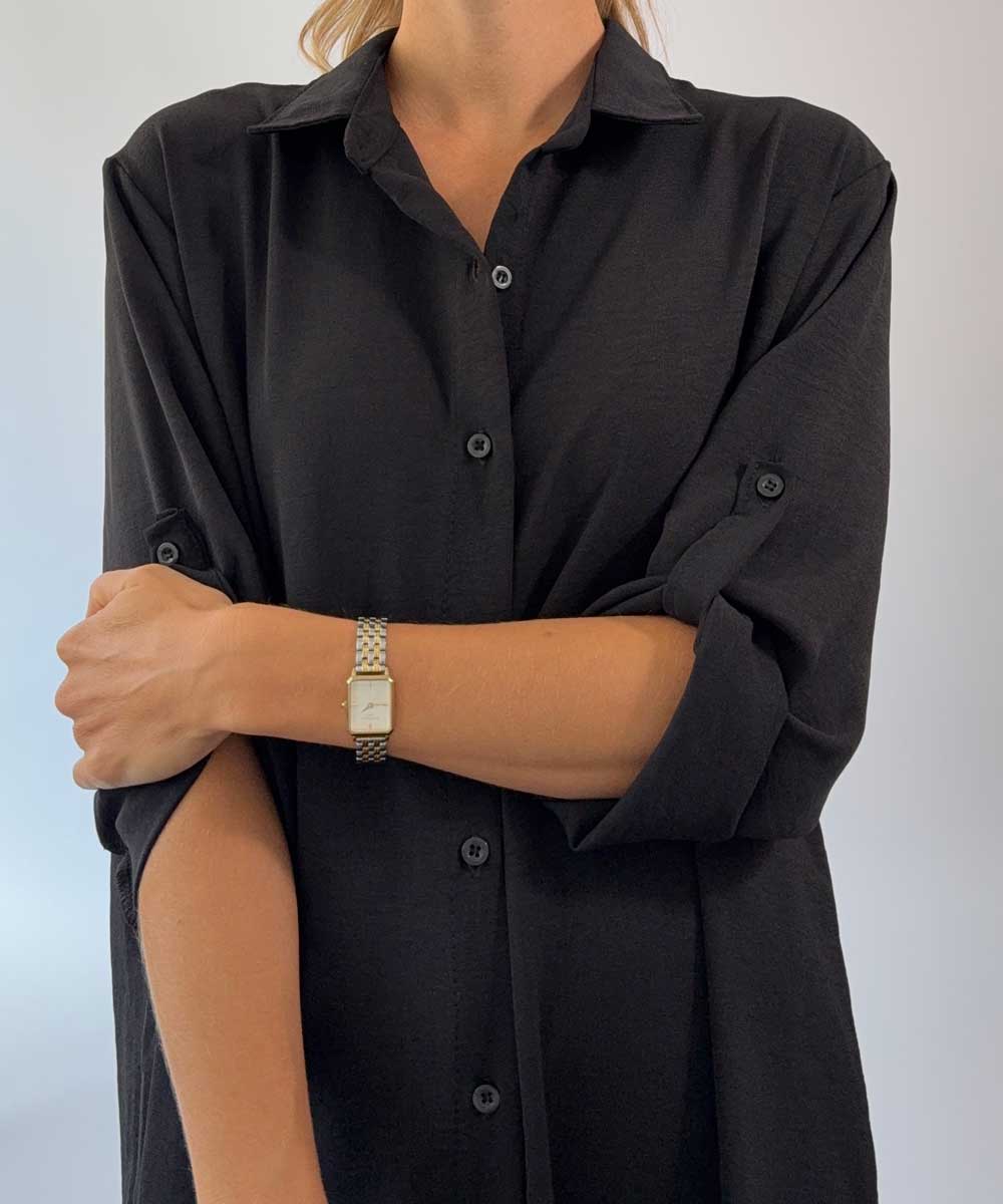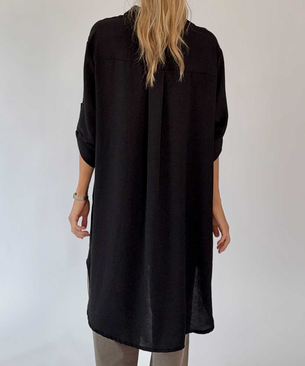 Härlig tunika från Chica London. Tunikan har knappar framtill, långa uppvikta ärmar med knapp och är rundad nertill. Snygg att bära både som klänning och eller leggings under. Tunikan är oversize i modellen och kommer i storlek onesize.