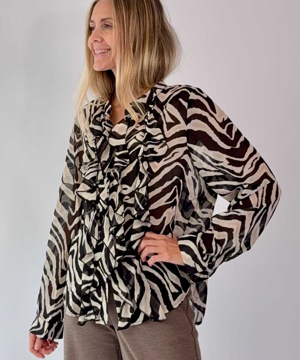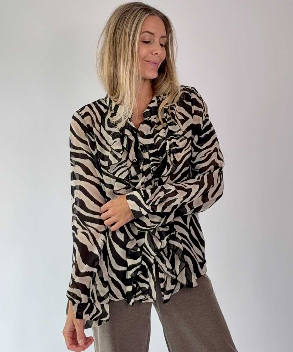 Cool blus i zebramönster från Chica london. Blusen har knäppning framtill som kantas av volanger, långa ärmar med knapp vid ämsluten och en rak lös passform. En perfekt blus i höst som passa lika bra till jeans som till kjol.