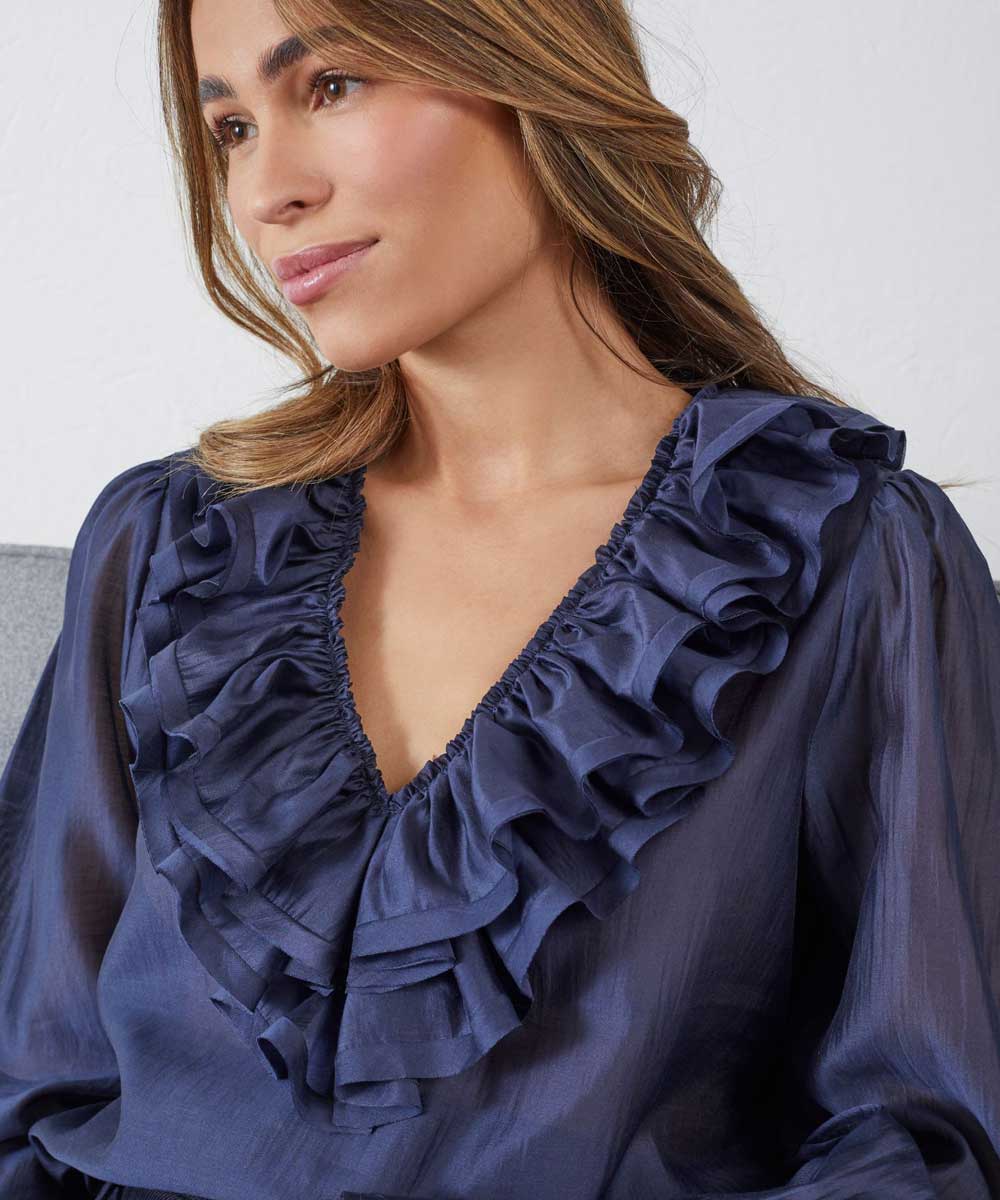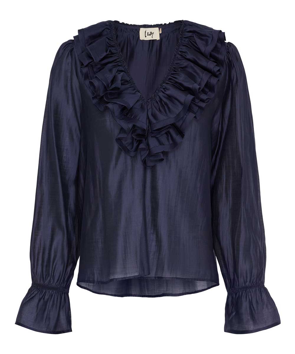 Klara Flounce från Isay är den perfekta blusen för som älskar feminina detaljer och en känsla av lyx i vardagen. Blusen har en djup v-ringning som kantas av dubbla volanger, långa ärmar med vidd och resår vid ärmsluten samt en lös passform.