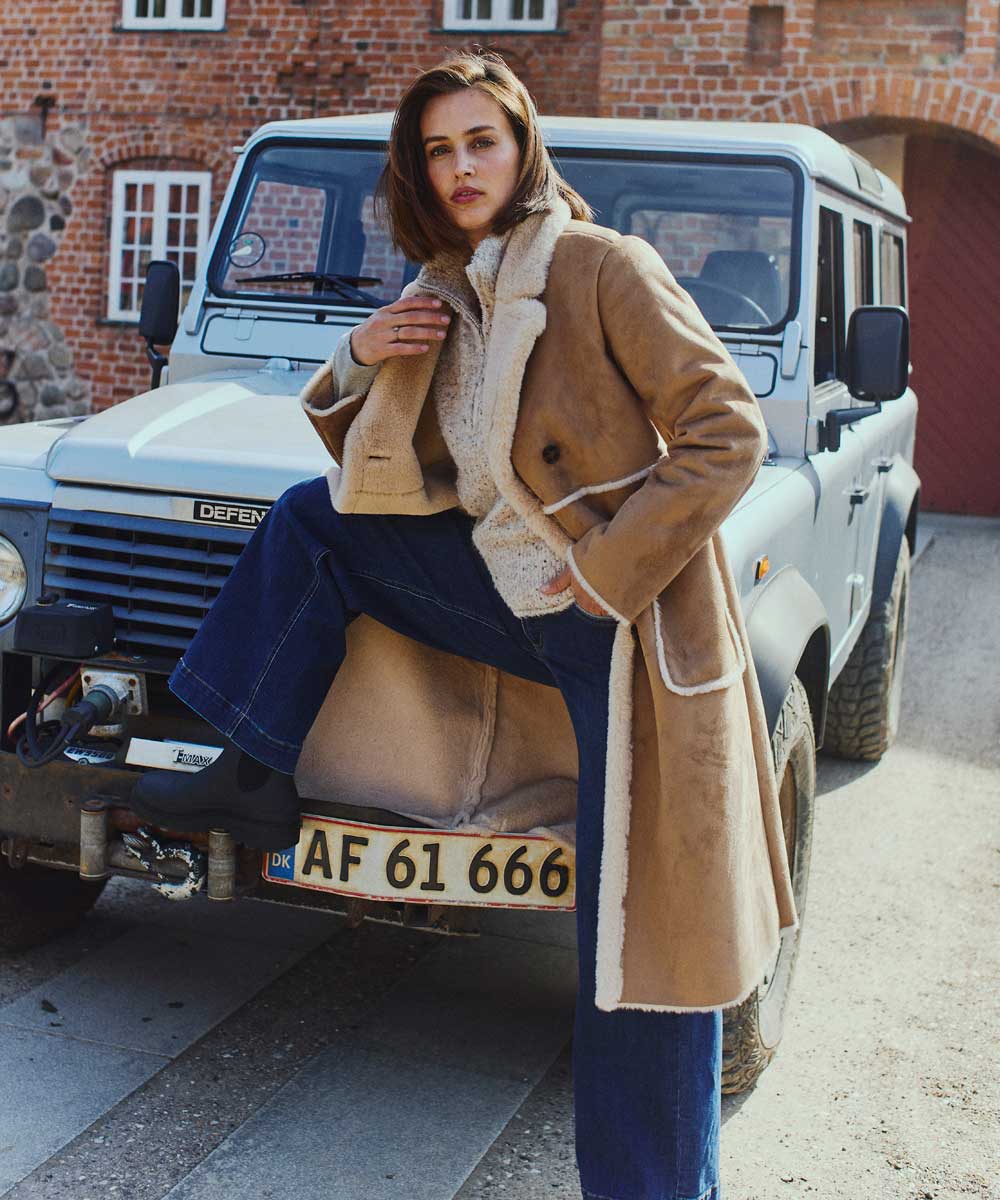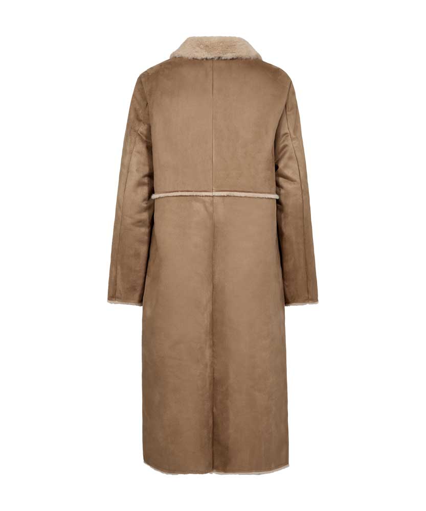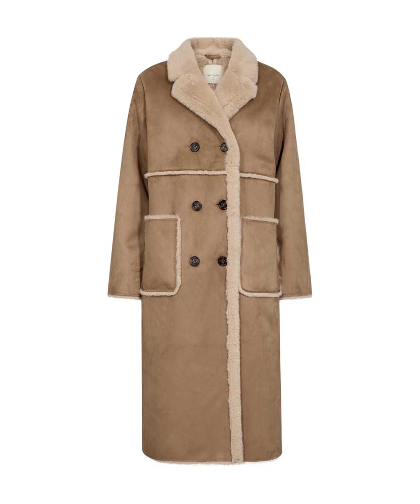 Lamse är en lång härlig kappa från Freequent. Kappan har ett mjukt och lyxigt mockaimitationsmaterial och ett mycket mjukt foder i fuskpäls. Dubbelknäppning med knappar, framfickor, slag och omvända sömmar för en snygg look.