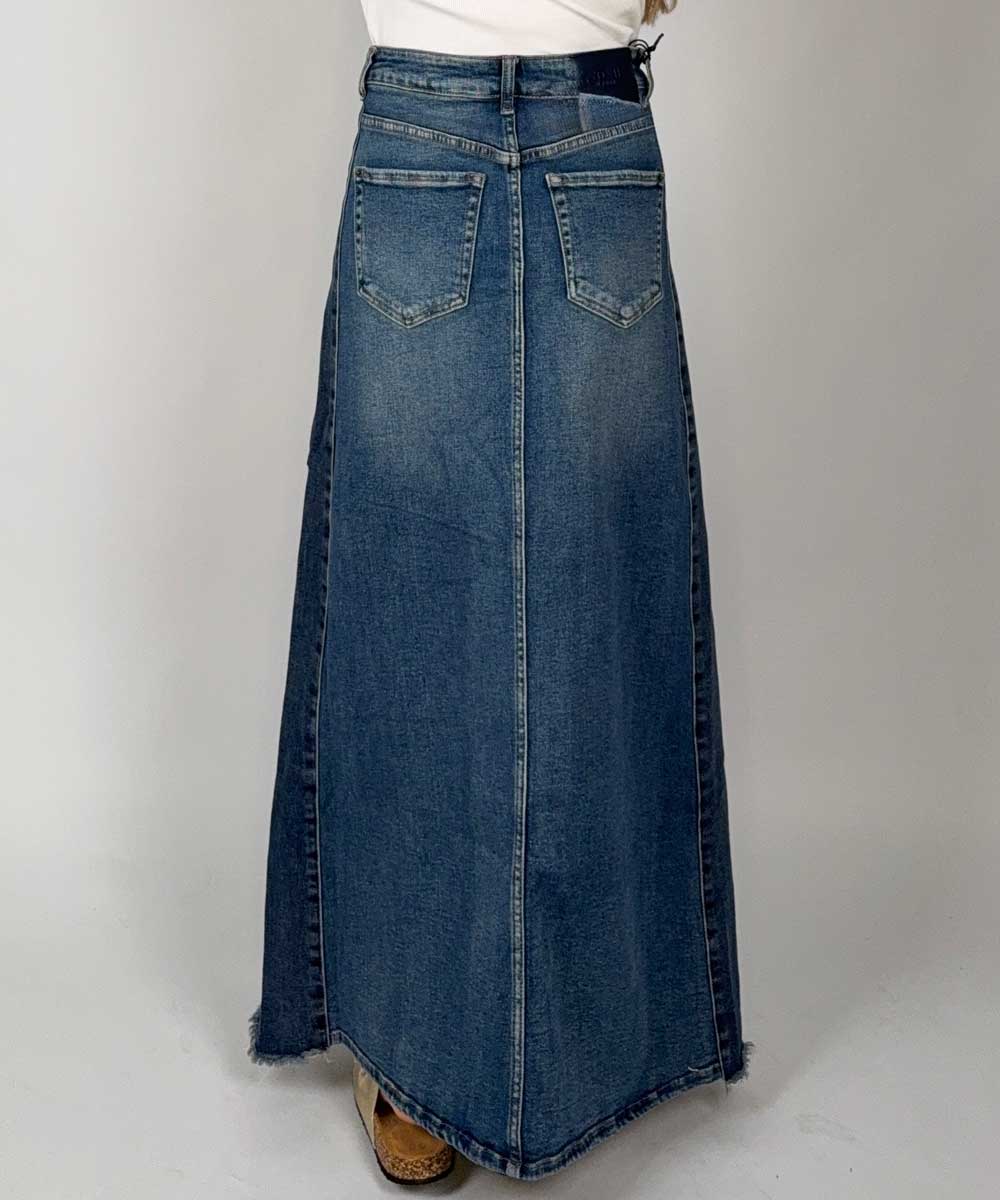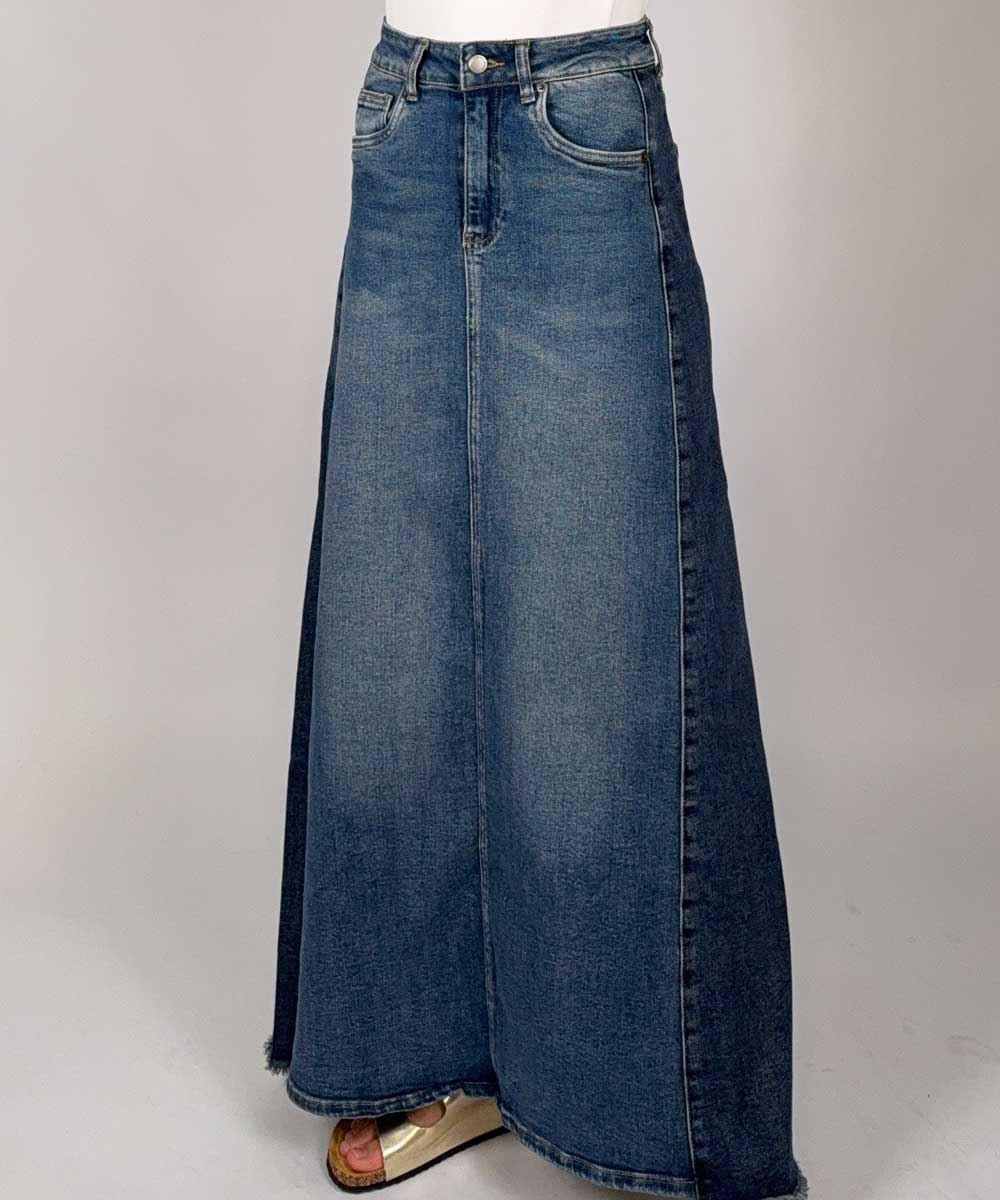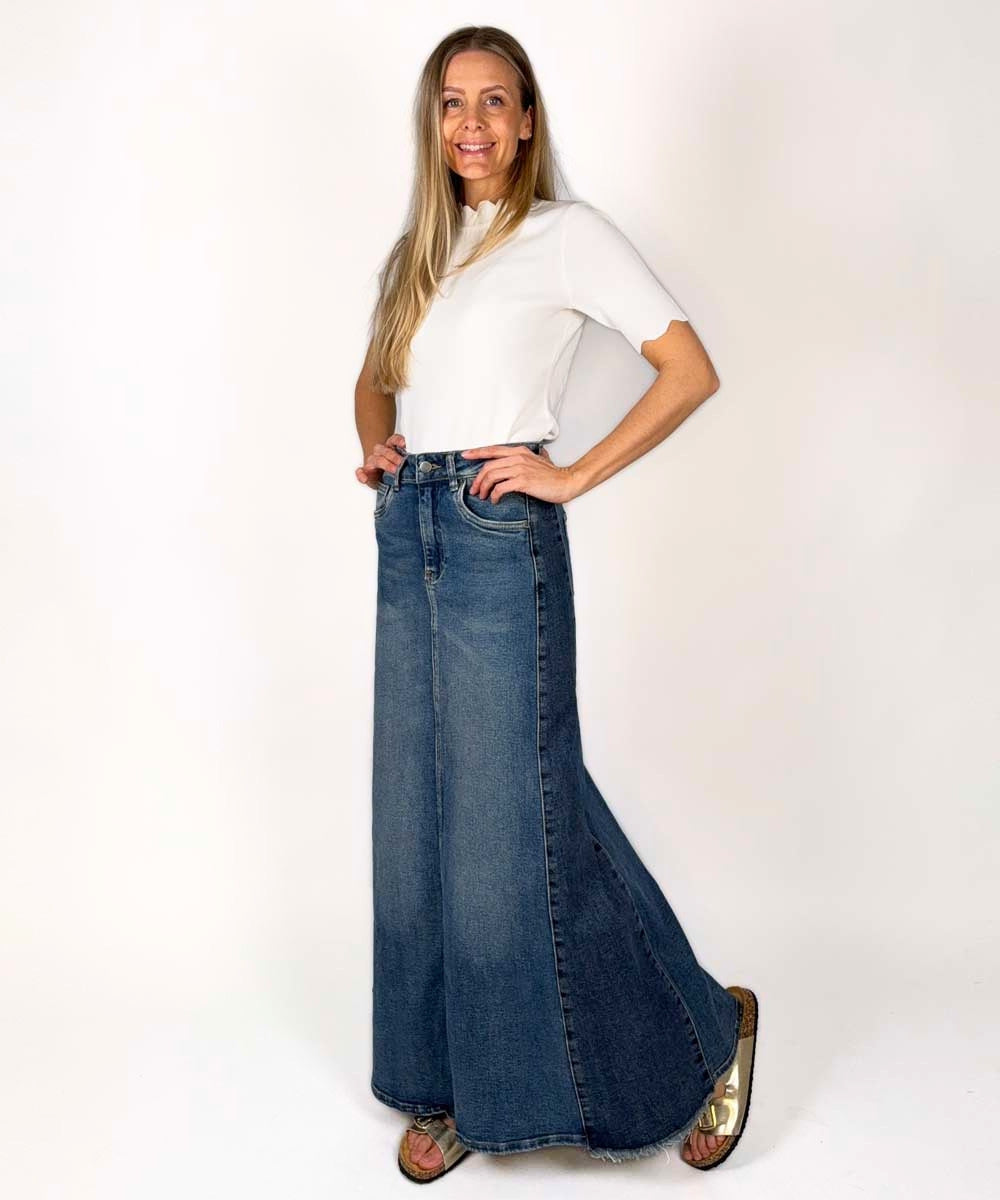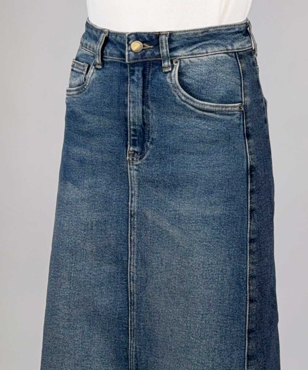 Cool hellång jeanskjol i en fin blå nyans från Jörlevik. Kjolen har en klassisk femficksdesign och en snygg A-linjeformad siluett.