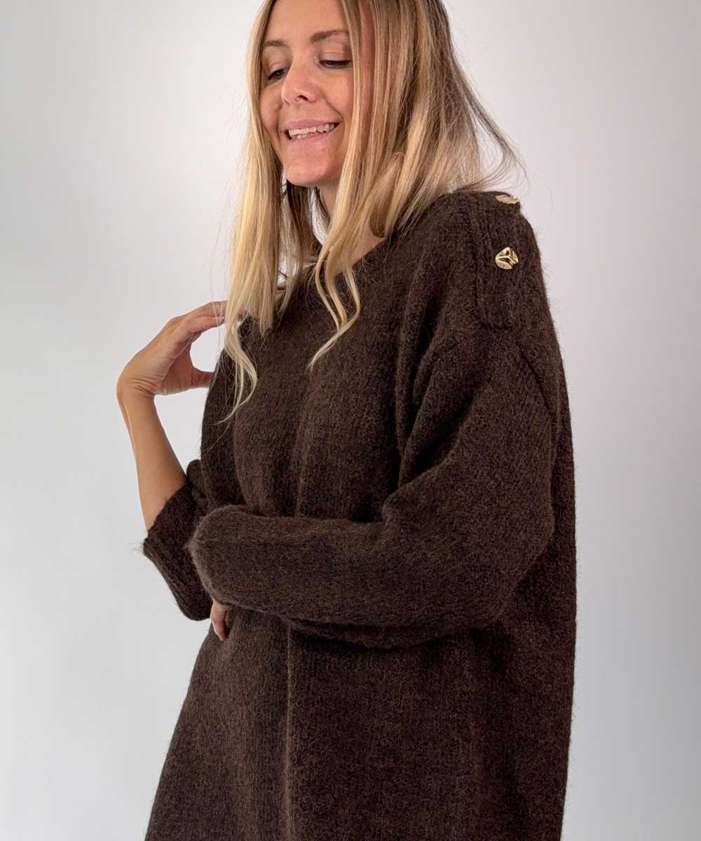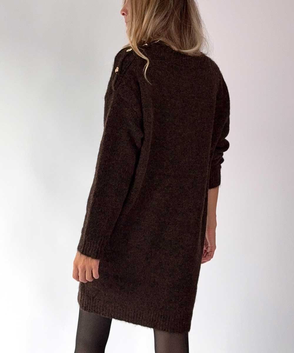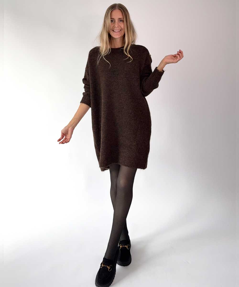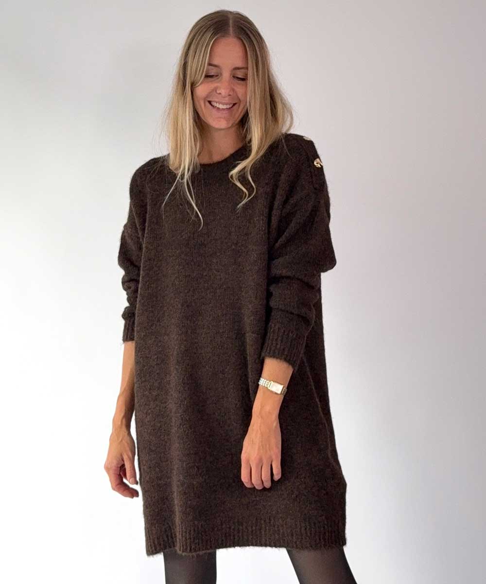 Superhärlig kort stickad klänning från Chica London. Klänningen har rund halsringning, fina dekorativa knappar på axeln, långa ärmar och en rak lös passform. Denna klänningen är kort och är även snygg att bära till byxor eller jeans som en lång tröja. Storlek onesize.