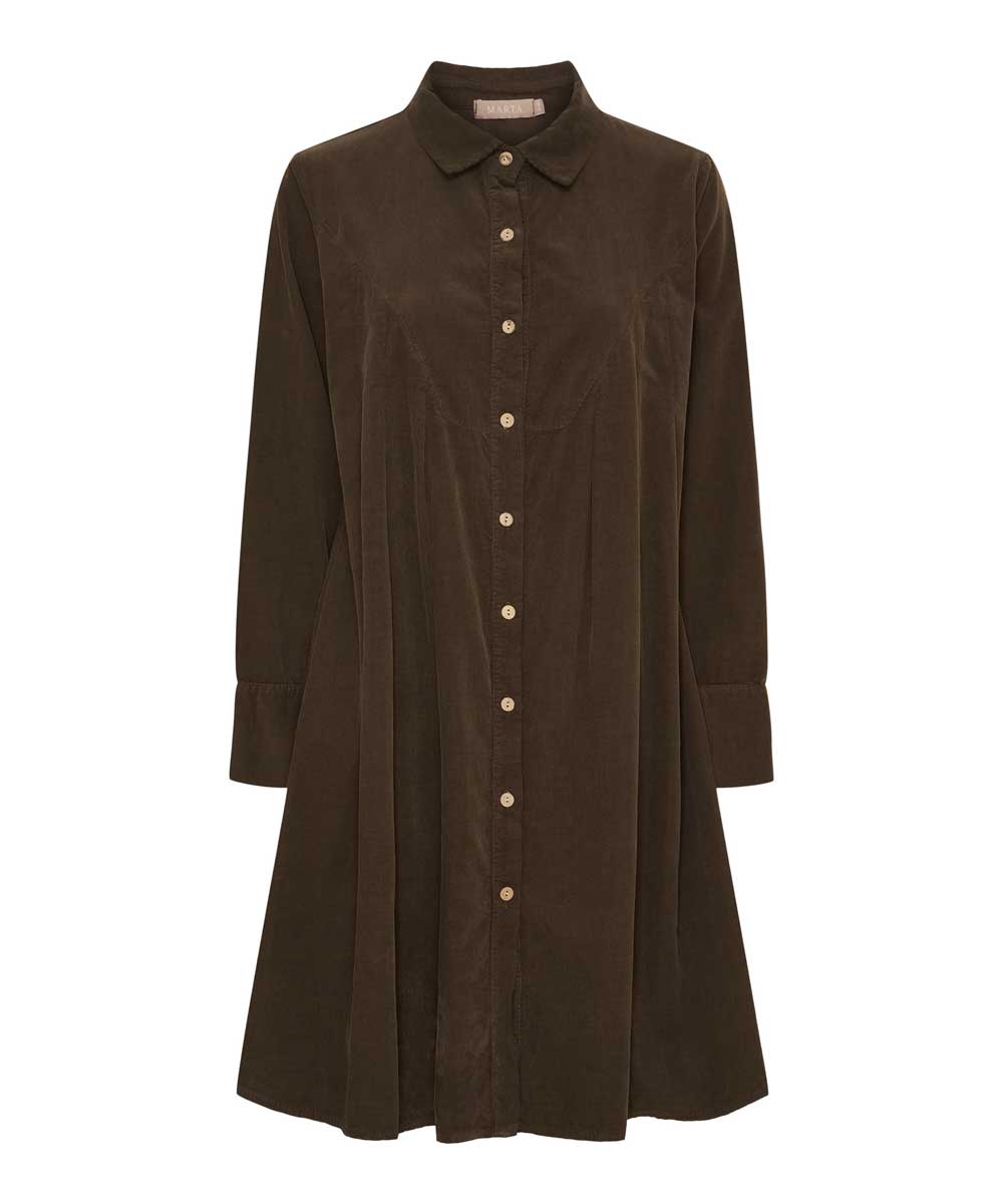 Gunvor är en fin skjortklänning i manchester från Marta Du Chateau. Klänningen har skjortkrage, knäppning fram, långa ärmar och en lätt utställd siluett.
