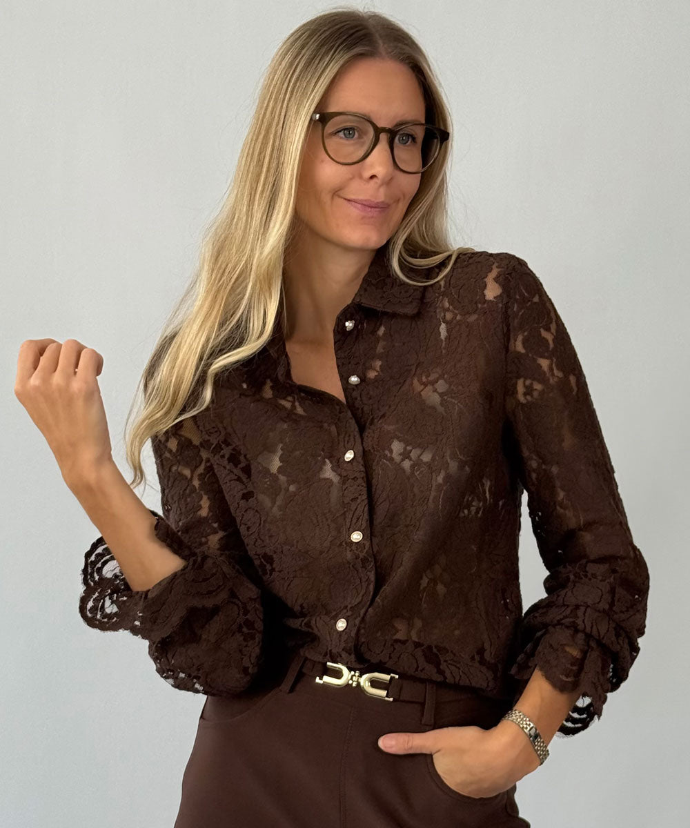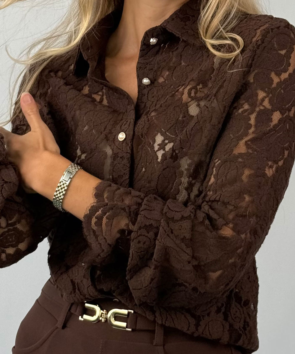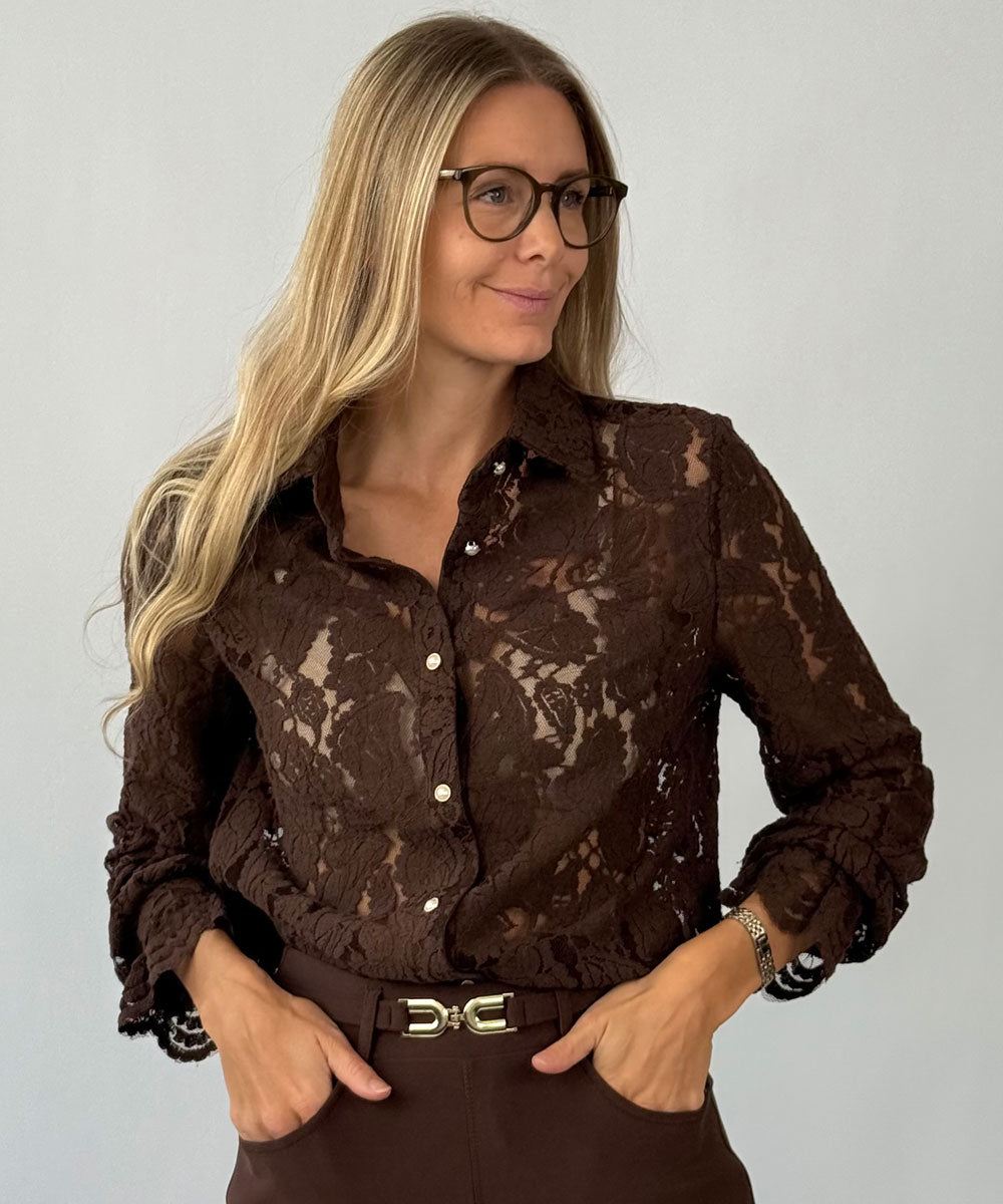Lacy är en vacker transparant blus i spets från Chica London. Blusen har krage, pärlknappar fram, långa ärmar med liten volang vid ärmsluten och en rak enkel passform.