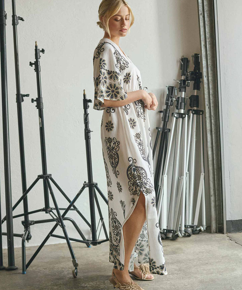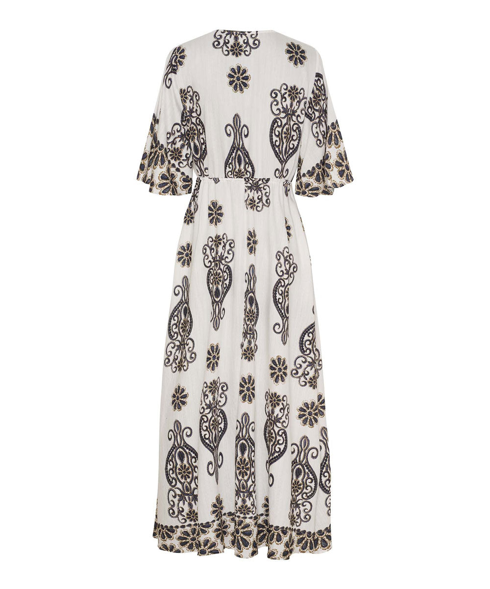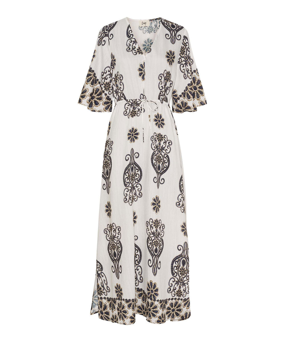 Ane Long är en fin maxiklänning i vitt med svart mönster från Isay. Klänningen har en lätthet både i utseende och rörelse. Den faller mjukt runt kroppen och får en fin längd i silhuetten. V-ringad hals, halvlånga ärmar med spetsdetaljer, knytband i midjan och höga slitsar i sidorna.