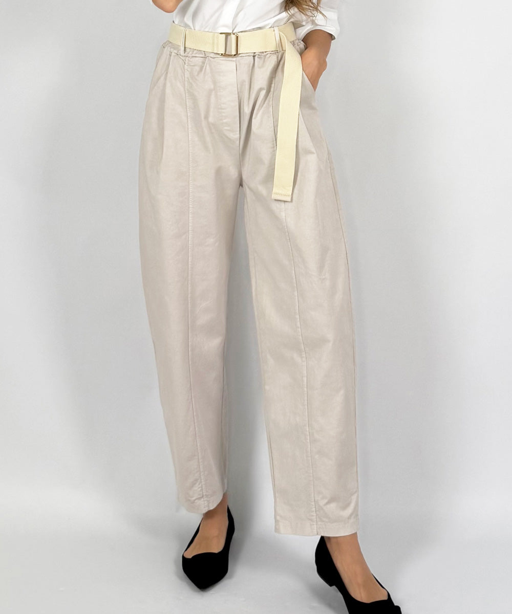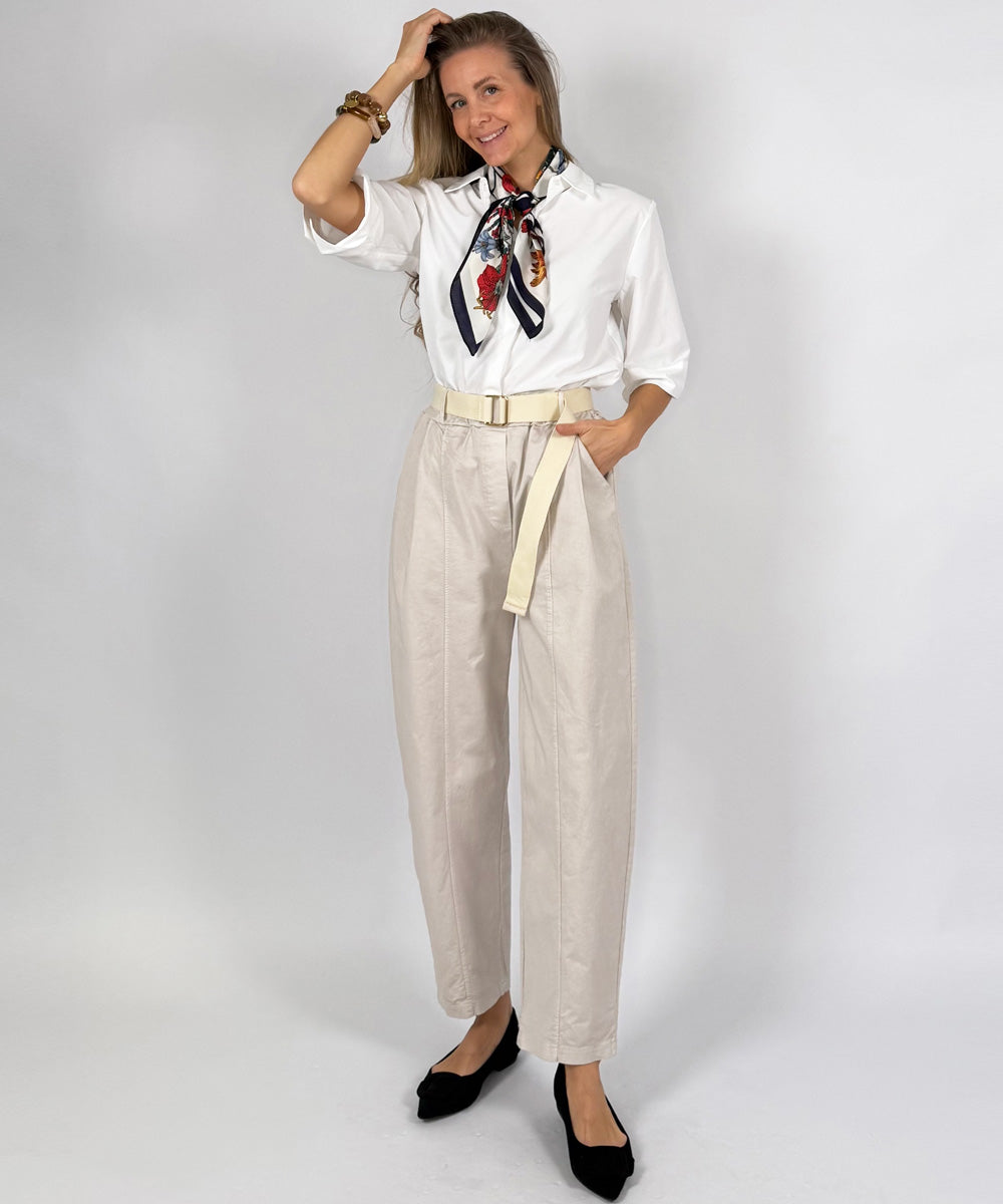 Cool byxa i barrel modell från Chica London. Byxorna har skön resår i midjan med avtagbart skärp, fickor i sidorna och dekorativa sömmar på benen framtill.