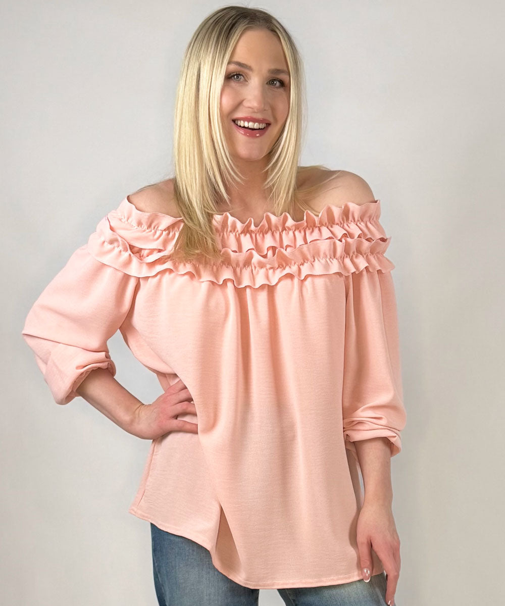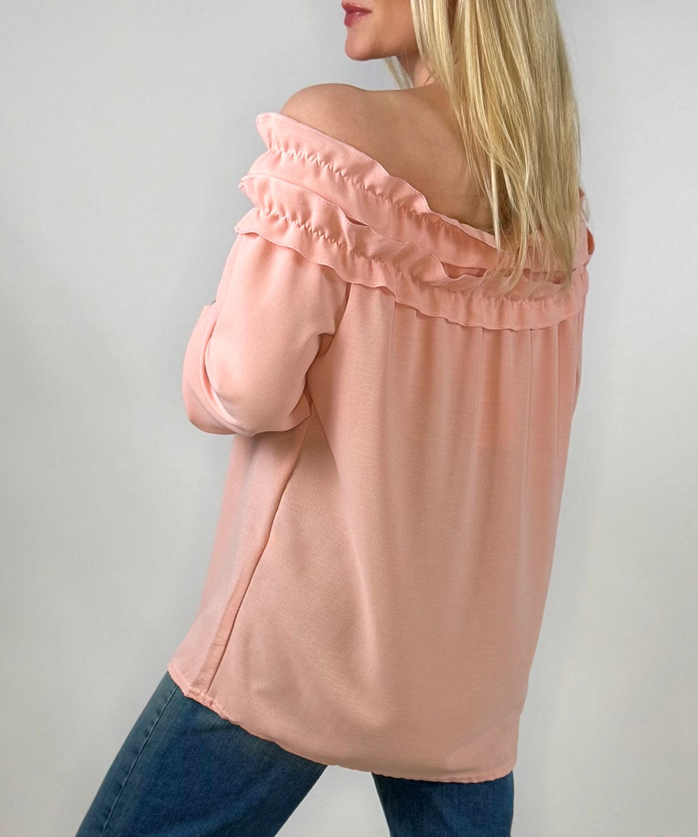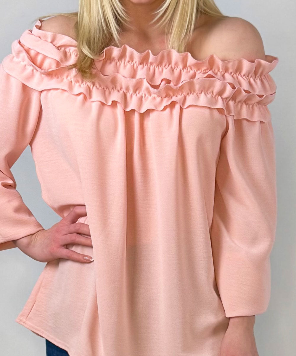 Cream är en fin blus i rosa nyans från Chica London. Blusen har fina volanger/krås runt halsringningen som även har resår så den går att bära offshoulder, långa ärmar med resår vid ärmsluten och en rak vid passform.