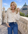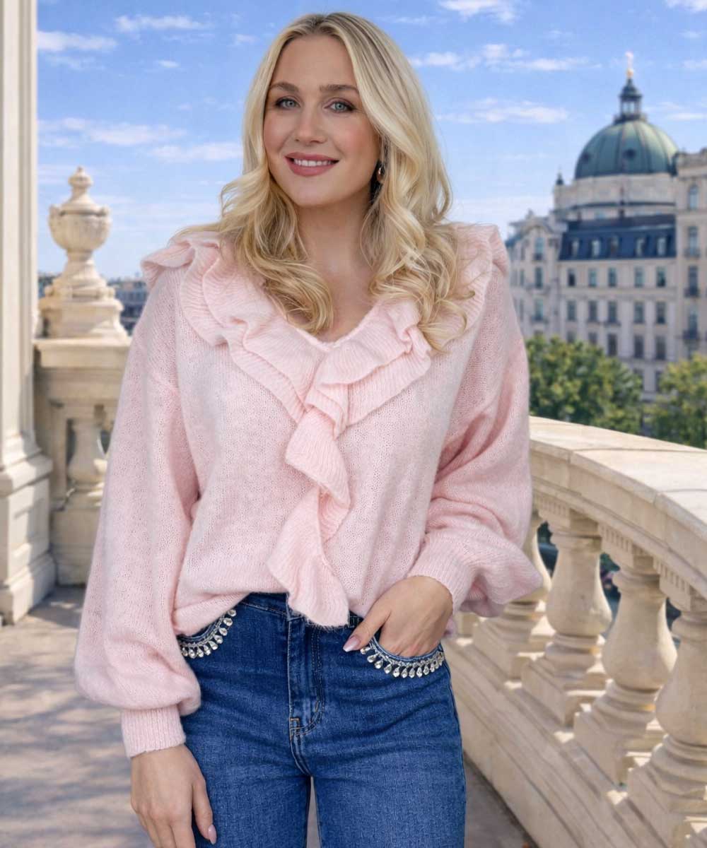 Superfin stickad tröja från Jörlevik. Tröjan har V-ringad hals som kantas av volang, långa vida ärmar med mudd vid ärmsluten och en lös enkel passform.