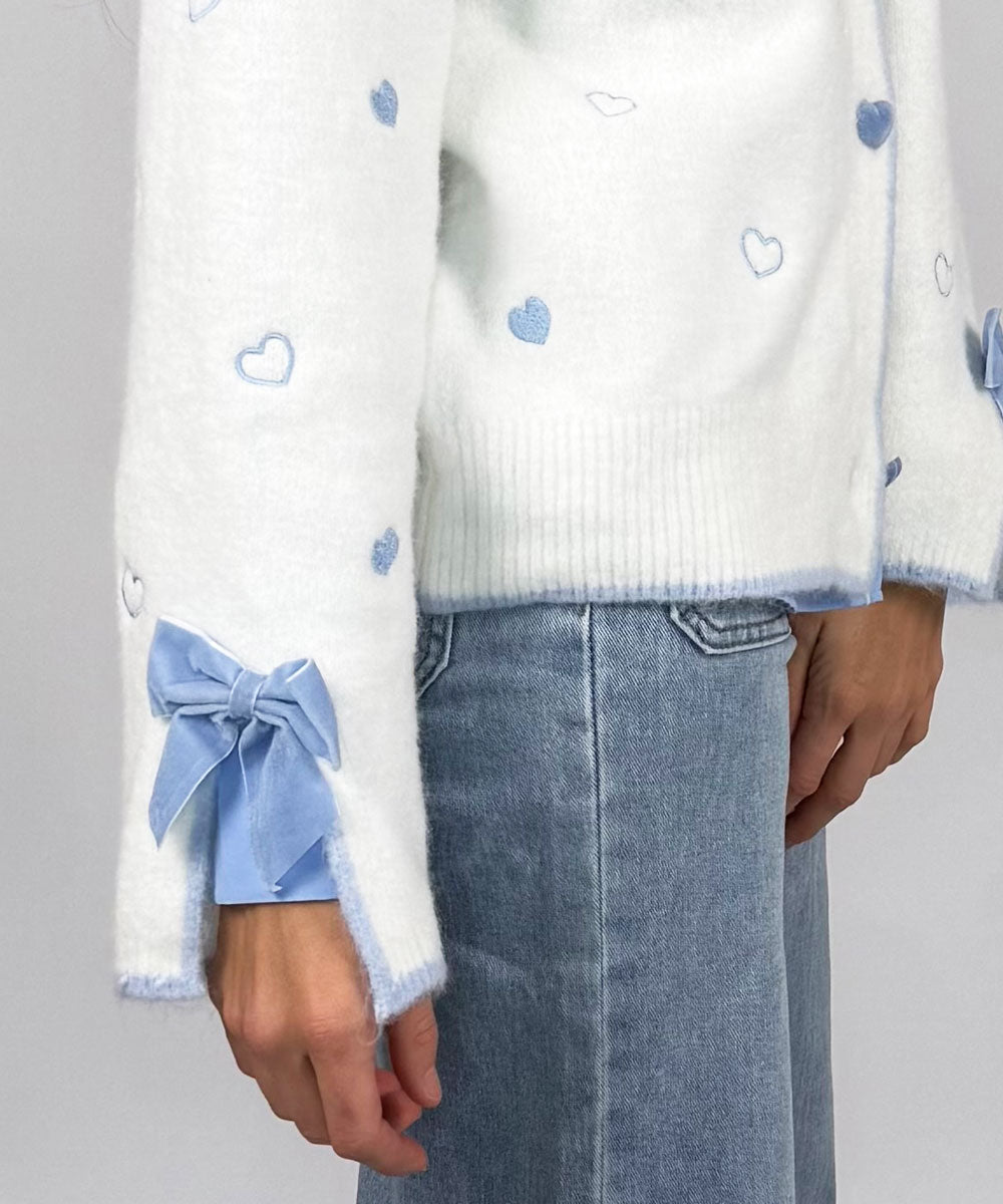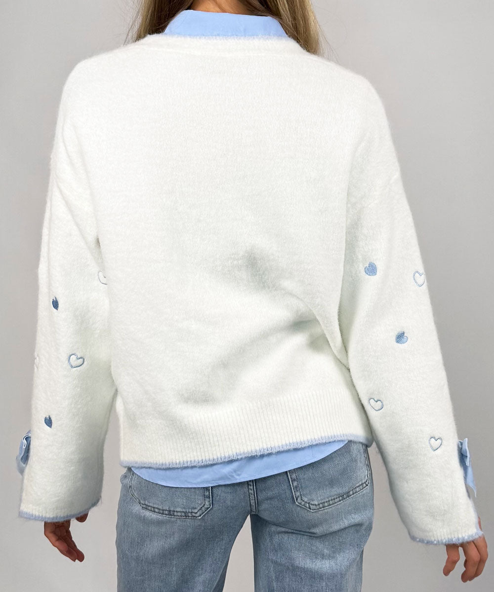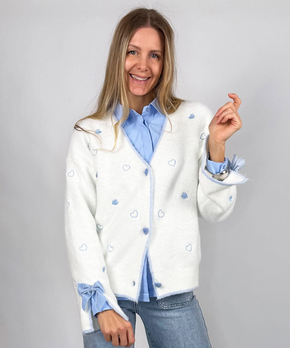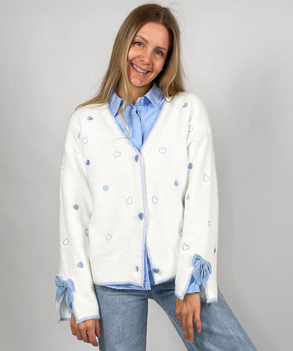 Jane är en fin cardigan från Jörlevik. Denna cardigan har v-ringning med knappar framtill och långa ärmar som avslutas med en liten slits och dekorativ rosett. Framsida och ärmar pryds av fina små hjärtan.