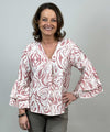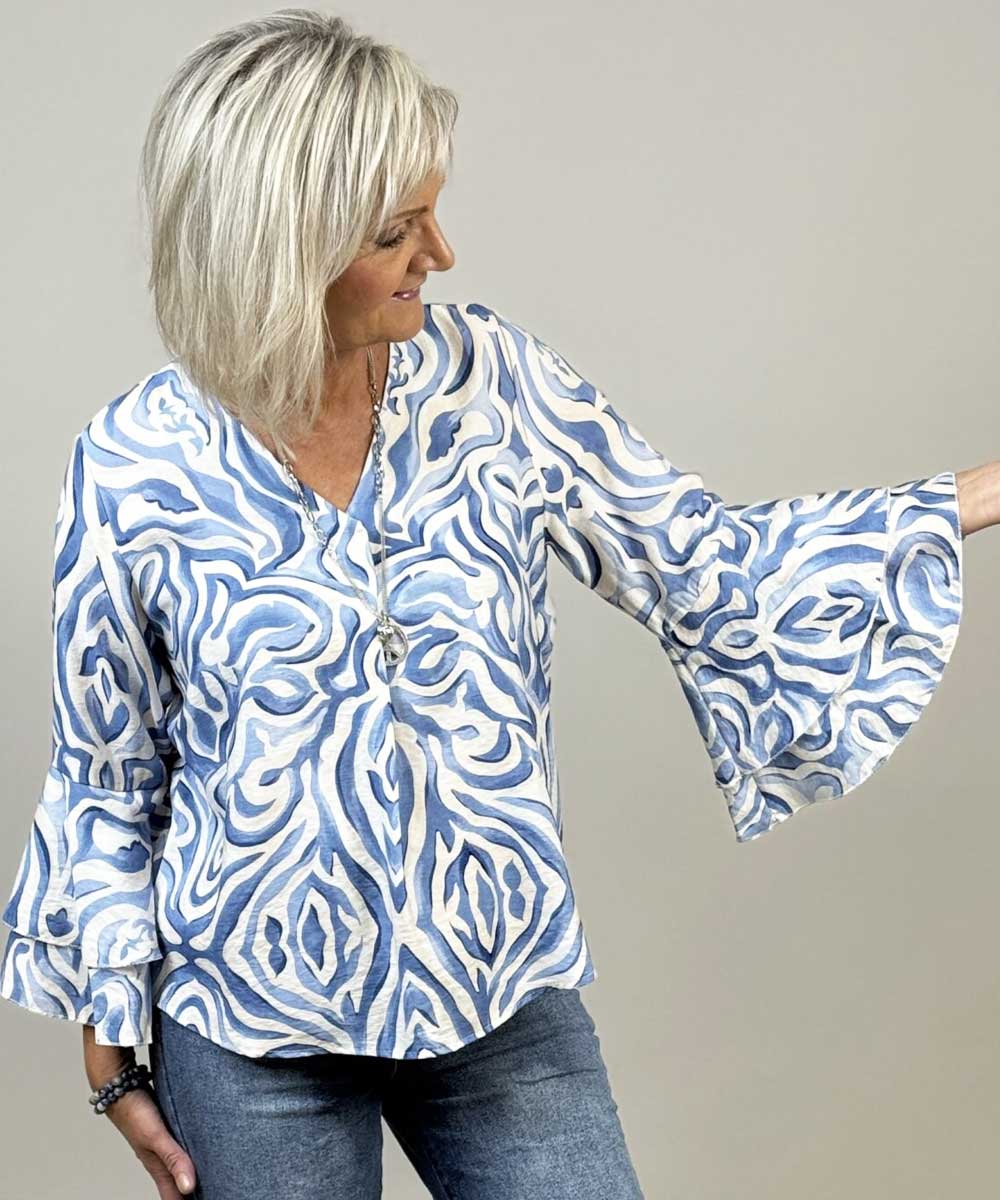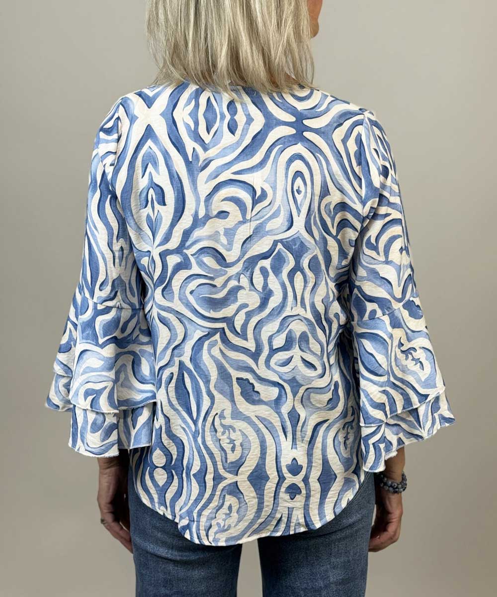 Miranda är en mönstrad blus från Mix By Heart. Blusen har v-ringning med veck och ärmar med volang.