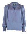 Moe är en vacker blus i satin från Continue. Blusen har v-ringad hals med liten krage, långa ärmar med smock vid ärmsluten och en rak enkel passform.