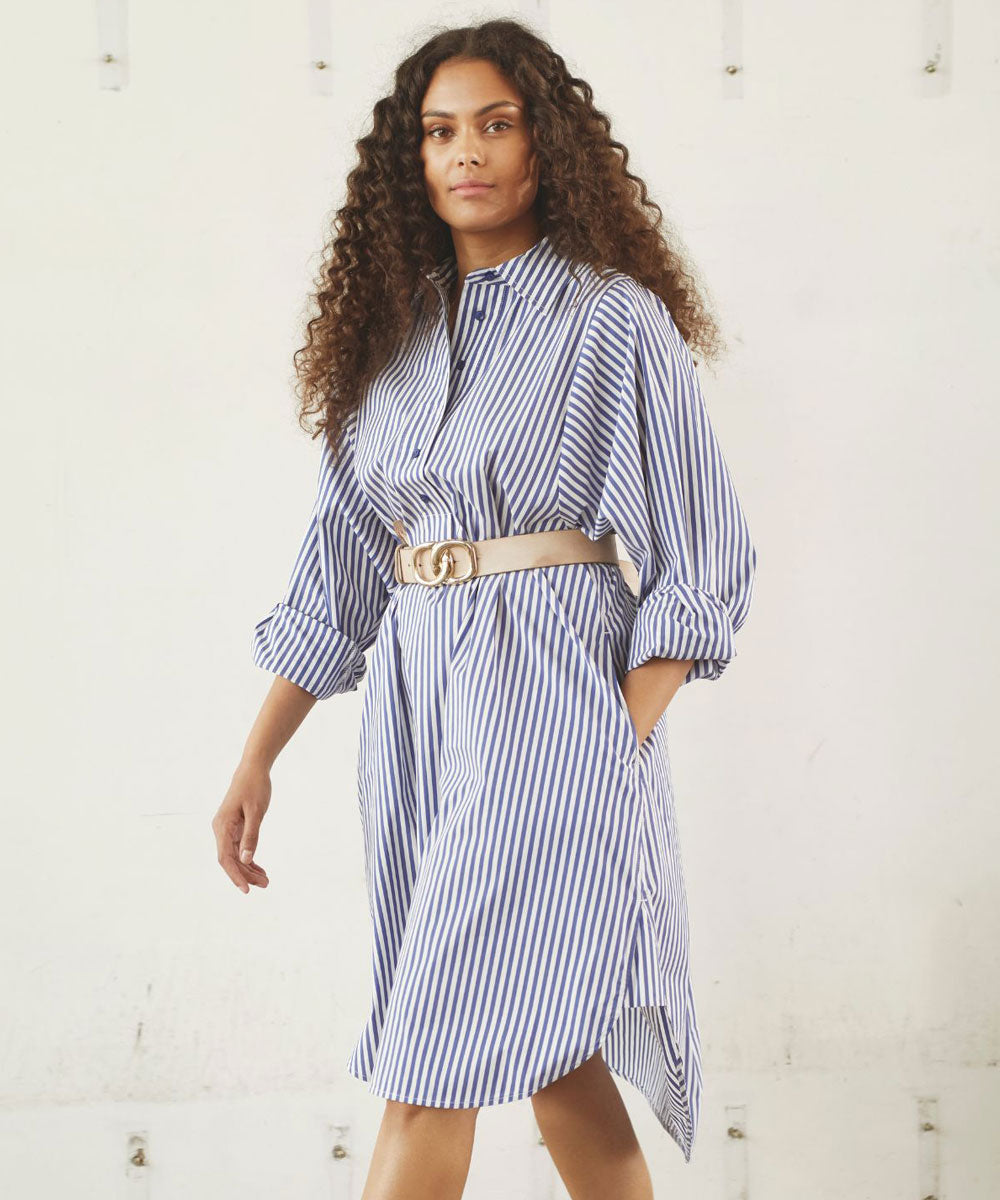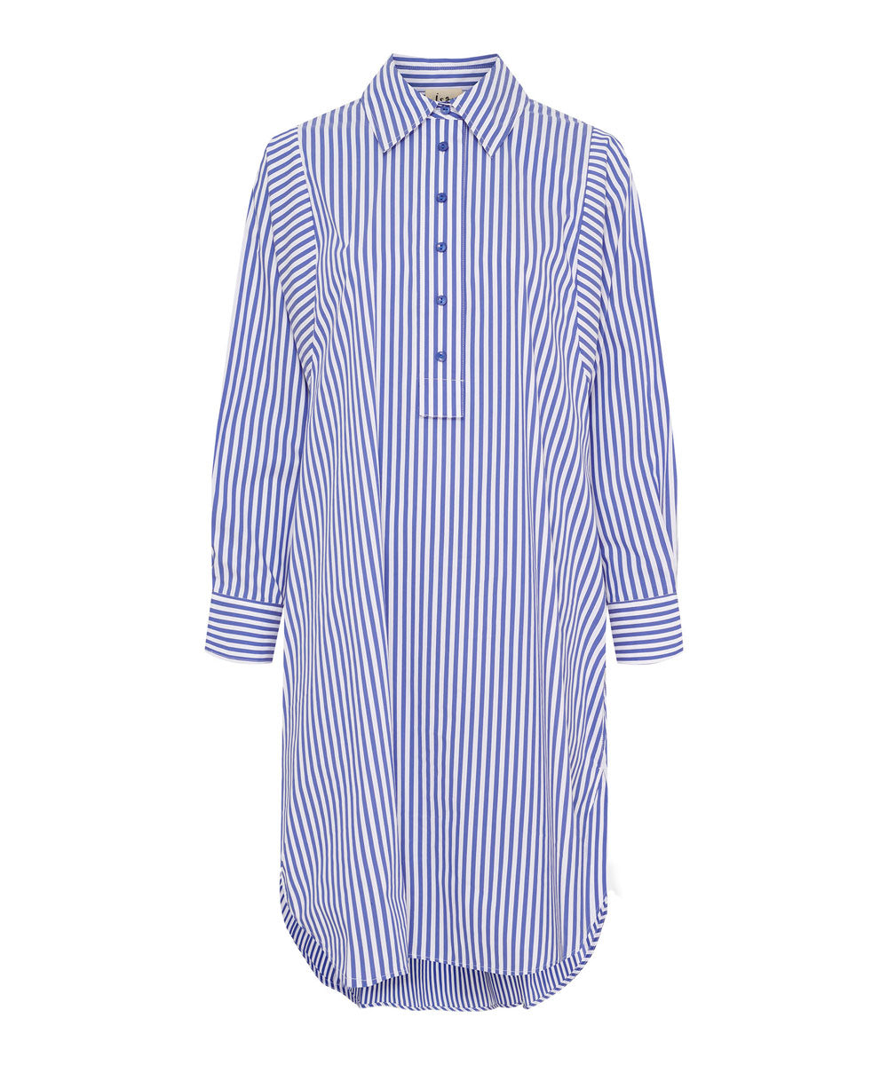 Sigga Striped är en klassisk skjortklänning med en enkel och avslappnad look från Isay. Klänningen har en klassisk krage med knäppning framtill över bröstet, långa vida ärmarna med manschetter, slitsar på båda sidorna och en skön avslappnad passform.
