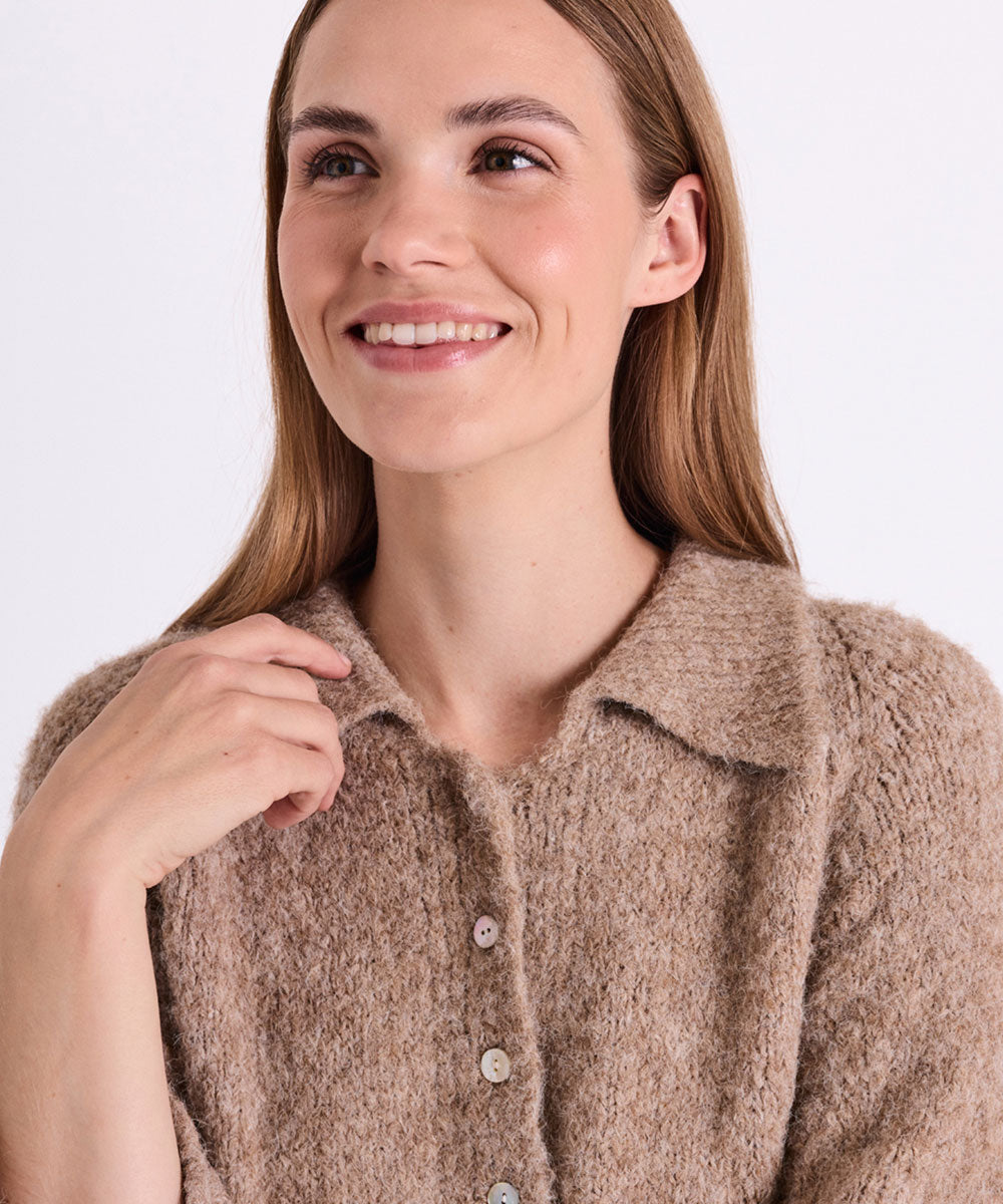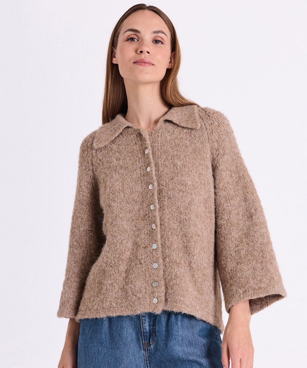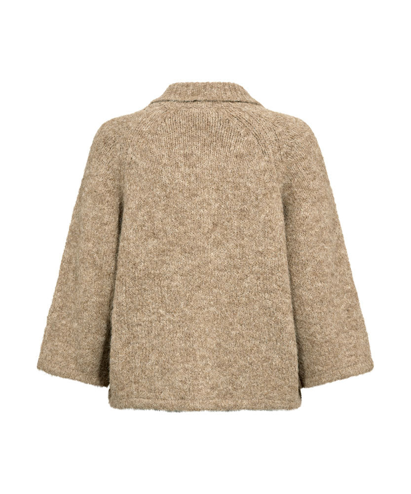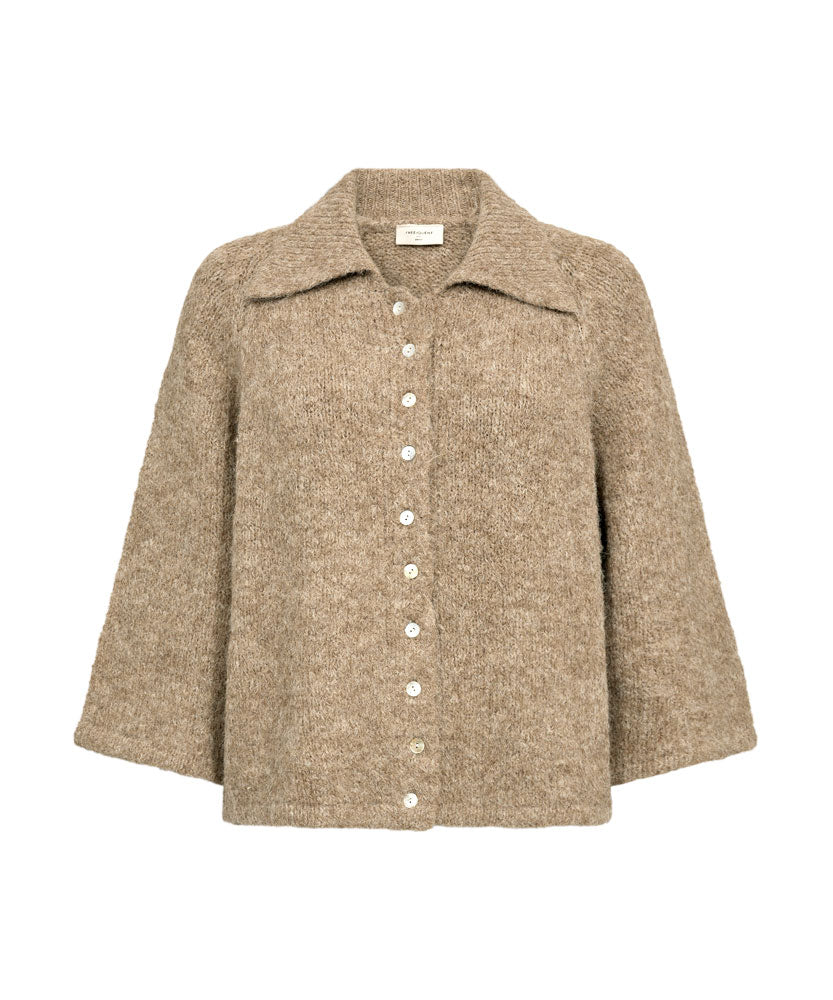 Härlig cardigan från Freequent i ett mjukt, stickat material. Koftan har en enkel silhuett med trekvartsärmar, vida ärmar, krage samt knappar framtill.