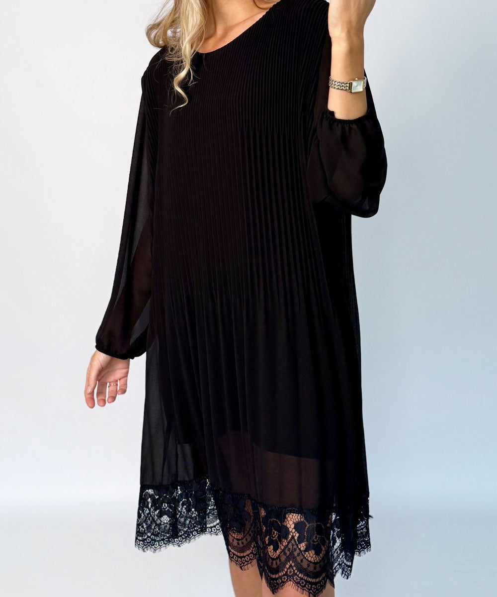 Kort plisserad klänning från Chica London. Klänningen har långa ärmar med resår vid ärmsluten, spets nertill och en A-linjeformad siluett med plisserad struktur.