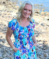 Kort klänning med härligt mönster från Chica London. Klänningen har rundad halsringning med resår, korta puffärmar med resår vid ärmsluten, fina dekorativa knappar, smock i midjan och volanger nertill.