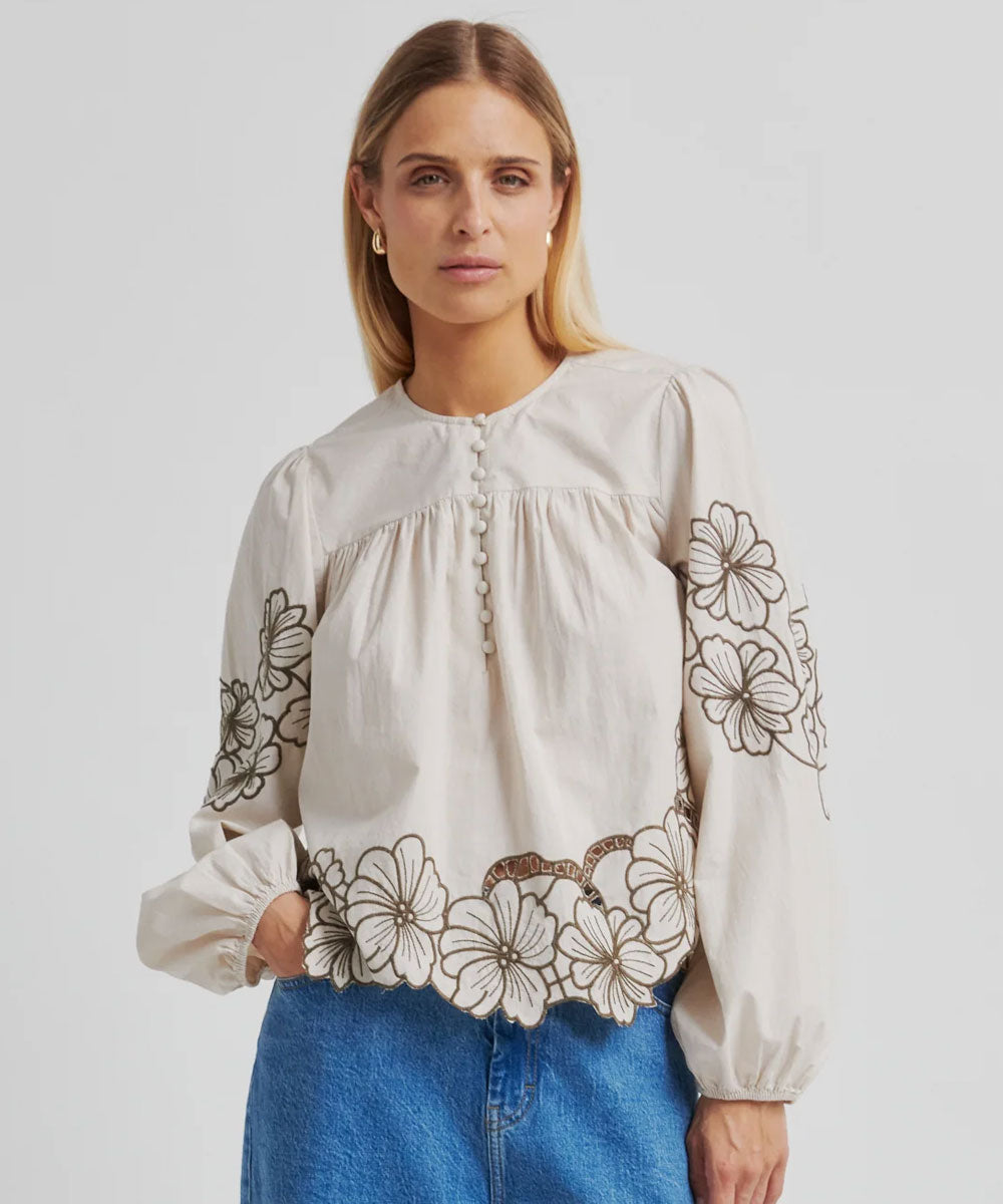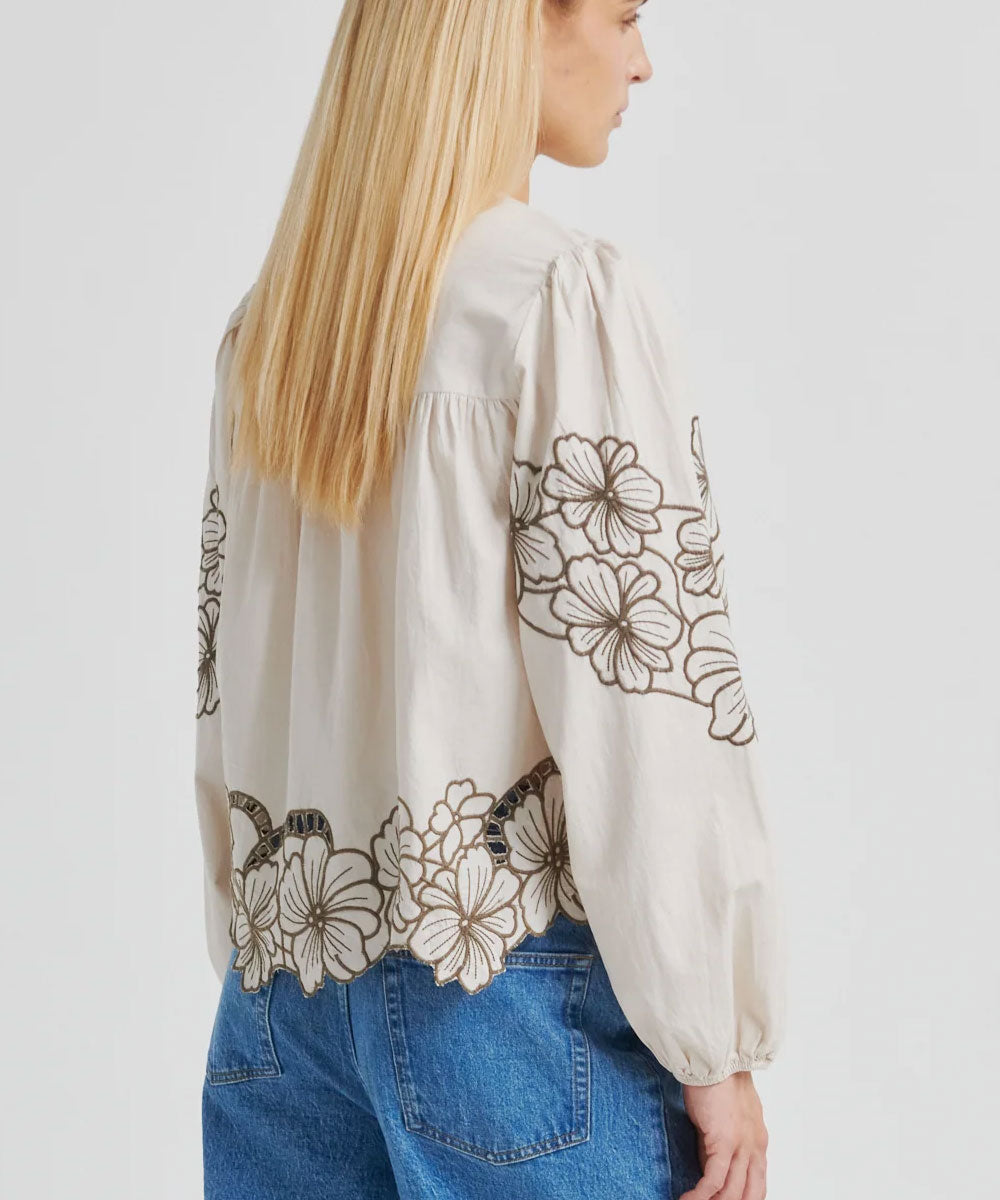 Elinor är en fin broderad blus från Second Female. Blusen är tillverkad i lätt bomull med broderade detaljer. Rund halsringning och klädd knappknäppning framtill. Långa ärmarm ed rynkade axlar och resår i ärmsluten som skapar en puffig form. Lös passform.