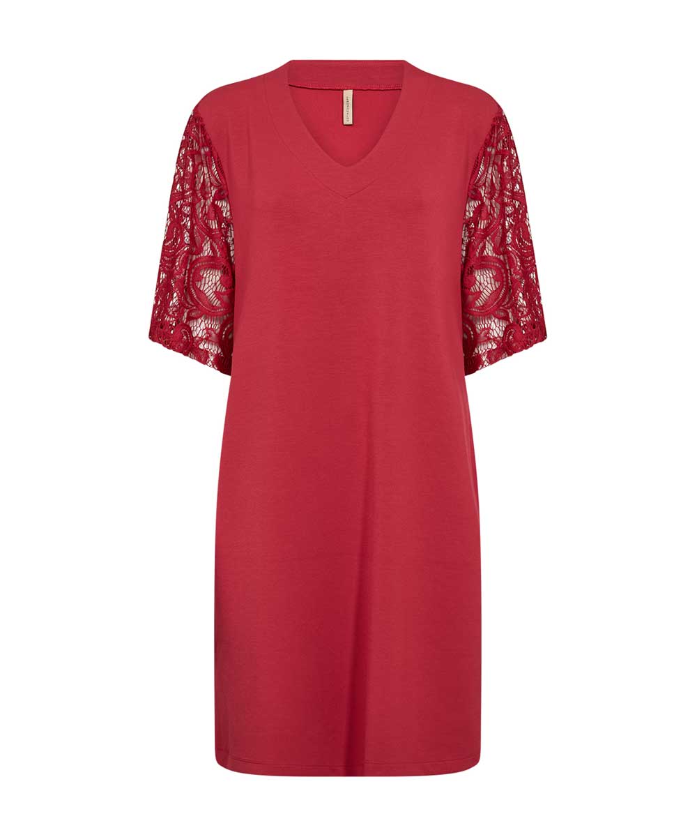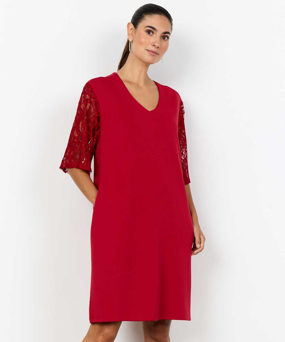 BANU 272 är en fin klänning från Soyaconcept. Klänningen har V-ringad hals, eleganta halvlånga spetsärmar, fickor i sidorna och en snygg enkel siluett. Lika snygg att styla till sneakers en vardag som till klackar vid festligare tillfälle.