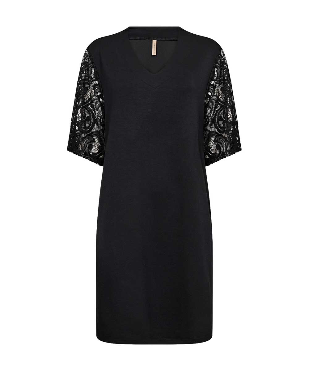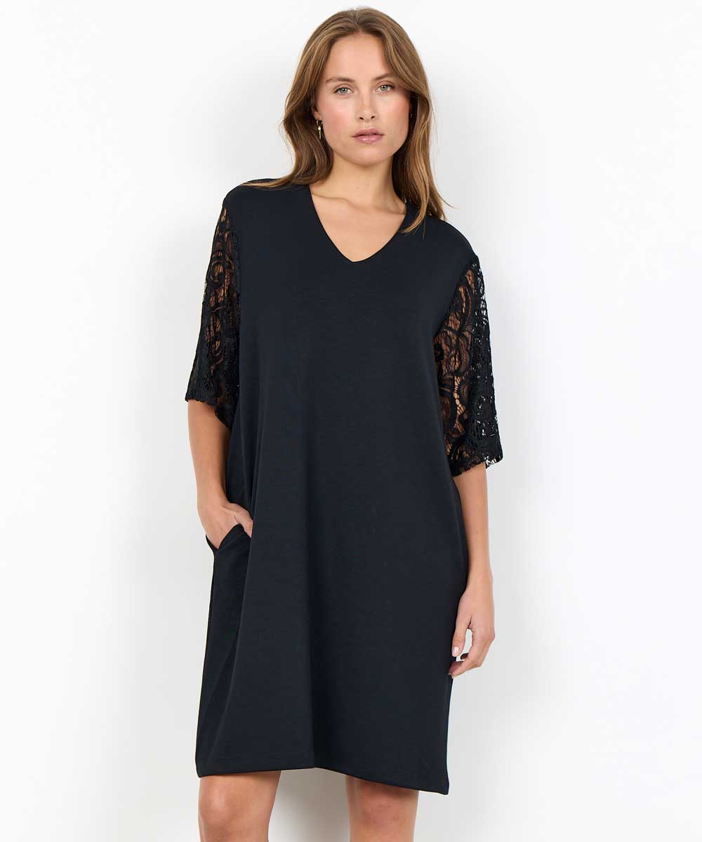 BANU 272 är en fin klänning från Soyaconcept. Klänningen har V-ringad hals, eleganta halvlånga spetsärmar, fickor i sidorna och en snygg enkel siluett. Lika snygg att styla till sneakers en vardag som till klackar vid festligare tillfälle.